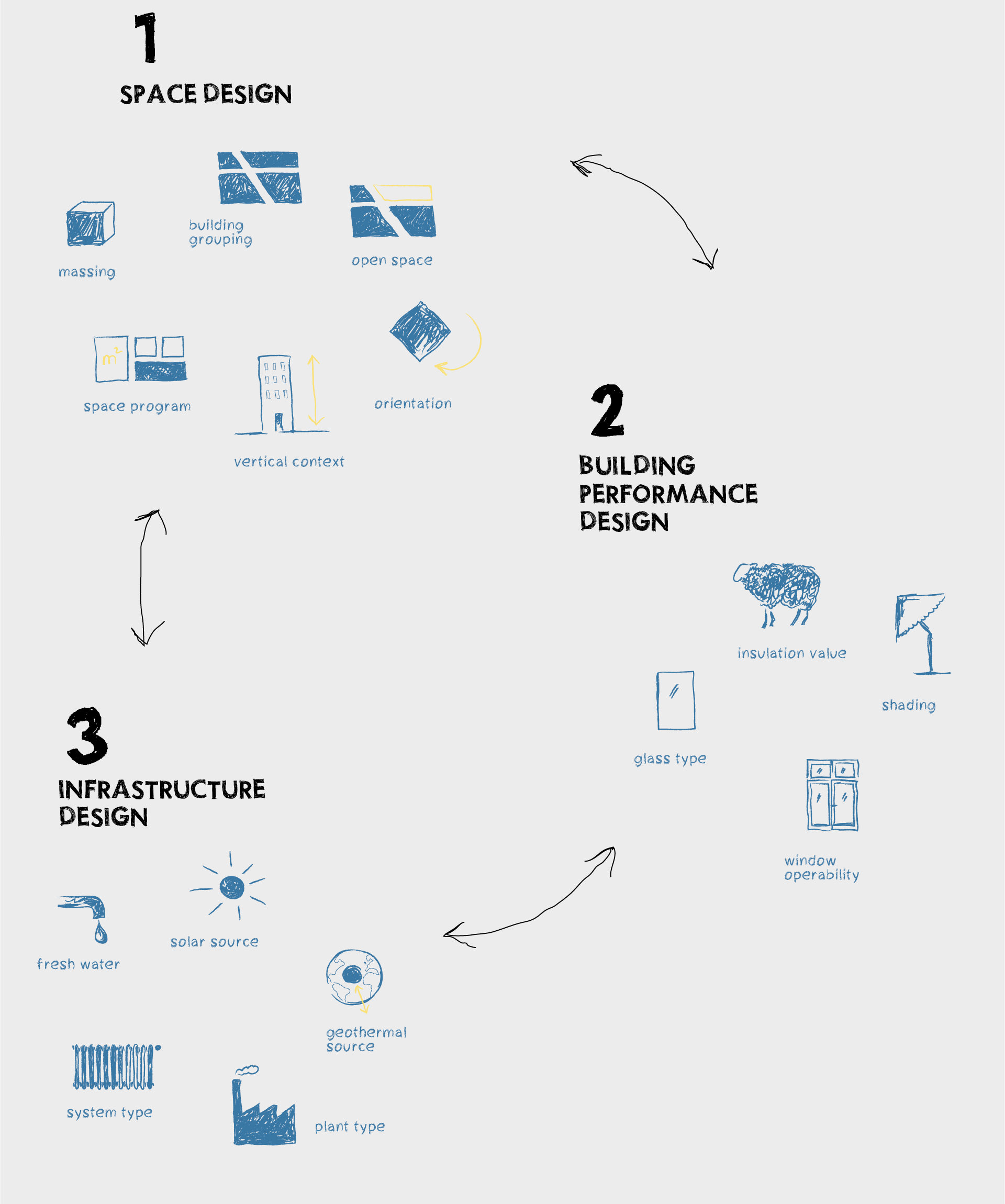 We follow a three-step approach to minimize energy use and maximize comfort in a master plan. Included in our analysis are the three architectural forms: buildings, streets and open spaces.
