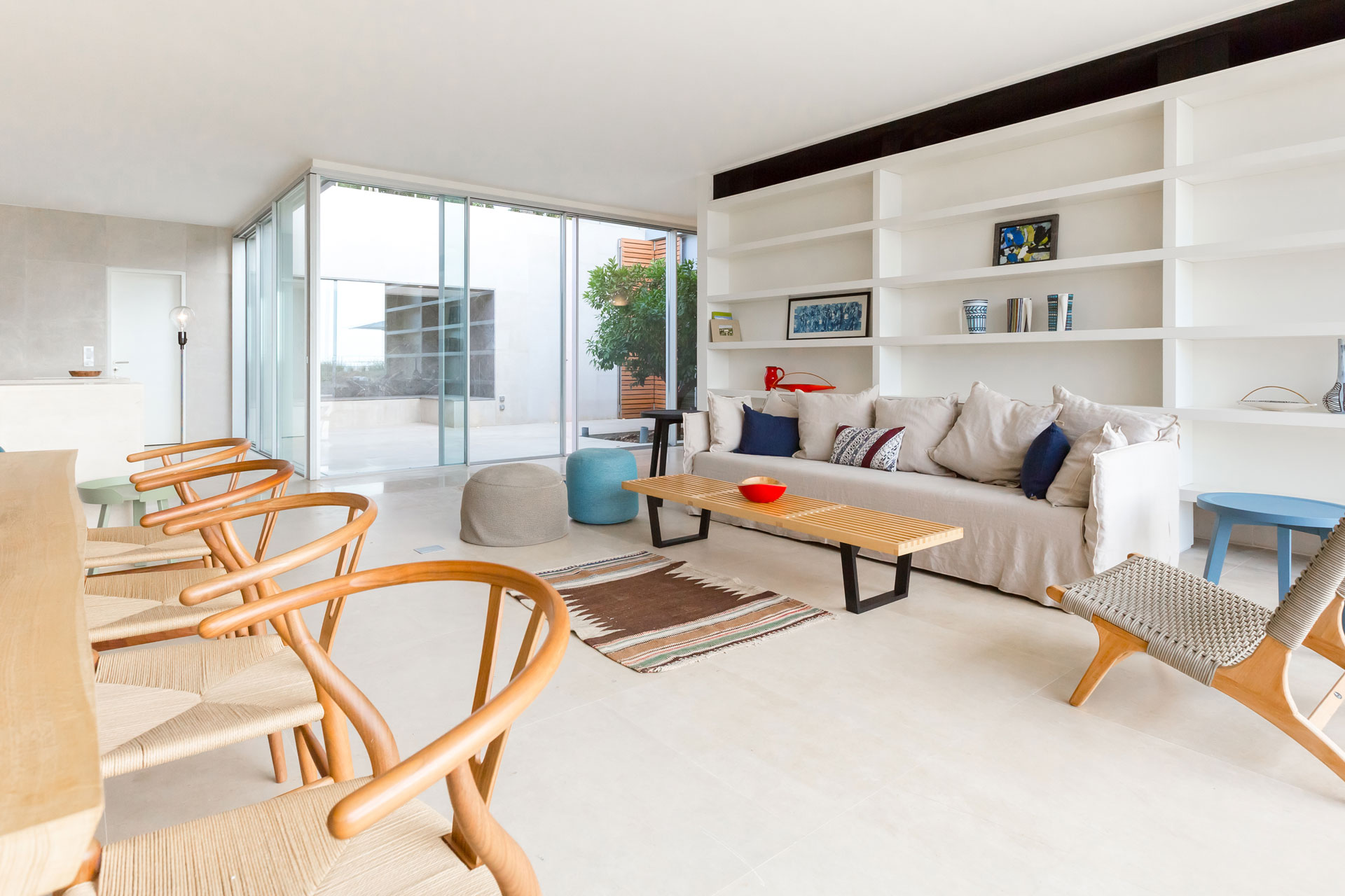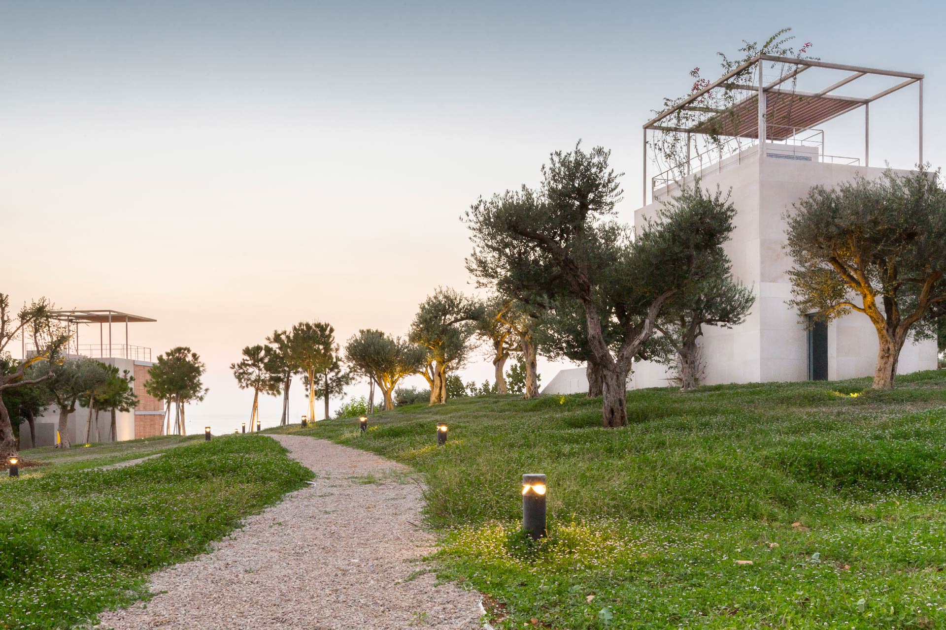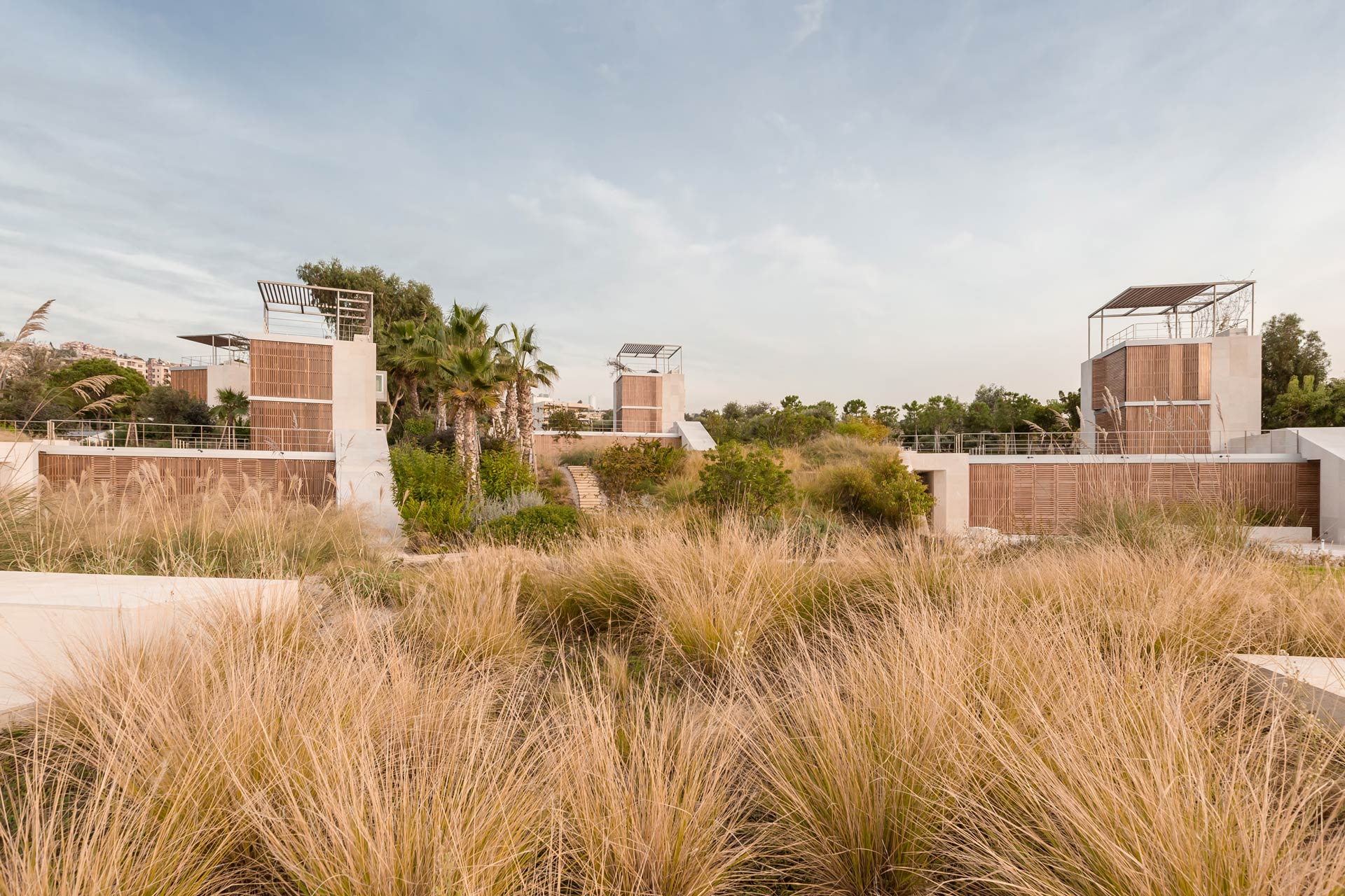 An der Küste von Aamchit entstanden vier neue hochwertige Einfamilienhäuser. Der Böschungswinkel des Standorts erlaubt es, die Häuser so in die Landschaft einzubetten, dass die Vorderseite nach Westen zum Meer hin freie Aussicht hat, eine Brise eintreten kann, der Boden aber die anderen Seiten des Hauses schützt. Die Häuser besitzen eine doppelwandige Mauer in U-Form, die im Westen offen ist, im Osten als Stütze gegen den Boden wirkt und im Norden und Süden parallel zur Böschung keilförmig abfällt. Sie isoliert und hält Bodenfeuchtigkeit ab und macht es möglich, kühle Luft in das Haus zu bekommen, was den Energiebedarf zur Kühlung senkt. Im Zwischenraum der doppelten Mauer ist auch Gebäudetechnik untergebracht, das Erdgeschoss bleibt so als Wohnraum erhalten. Der hintere östliche Teil ist als Hof gebaut, ermöglicht gute Querlüftung und schafft ein Mikroklima gegen extreme Wetterlagen. Die südöstliche Seite des Hofes ist strategisch als Turm ausgelegt und beeinflusst das Raumklima: Er schirmt den Hof gegen Osten und Süden von der Sonne ab, es entsteht ein Temperatur- und Luftdifferential und damit natürliche Luftbewegung im Haus. Der Turm wirkt als Kamin und führt passiv die heiße Luft ab. Treppe und Badezimmer sind auf der Ost- und Südseite des Turms angeordnet und bieten thermische Masse gegen die Sommerhitze. Der Winkel im Nordwesten ist nicht weiter strukturiert; die Zimmer verwandeln sich durch Öffnen der Fenster in Balkone. Diese Kombination von Hof und Turm stellt einen neuartigen Haustypus dar. Weitere Systeme unterstützen die Courtower-Klimastrategie: Ein Gravivent-Wärmetauschersystem kühlt passiv die Räume im Haus. Das mit Schwerkraft betriebene System ist in die Schränke der Zimmer eingebaut. Die Kälte dafür liefert eine Wärmepumpe, die an der Primärseite an kühles Meerwasser angeschlossen ist. Bei Bedarf führt eine mechanische Anlage Frischluft über einen Erdkanal zu, der sie vorkonditioniert. Die Mauern sind mit hellem lokalen Naturstein verkleidet; hölzerne Läden schützen die Fenster vor der Sonne, lassen wenig Strahlungswärme herein und schaffen ein pufferndes Luftkissen. An der Westfassade verzögert ein Baldachin aus Segeltuch den Eintritt von direktem Sonnenlicht in das Haus bis in den Nachmittag hinein und erzeugt über der Hauptfassade einen Luftspoilereffekt.