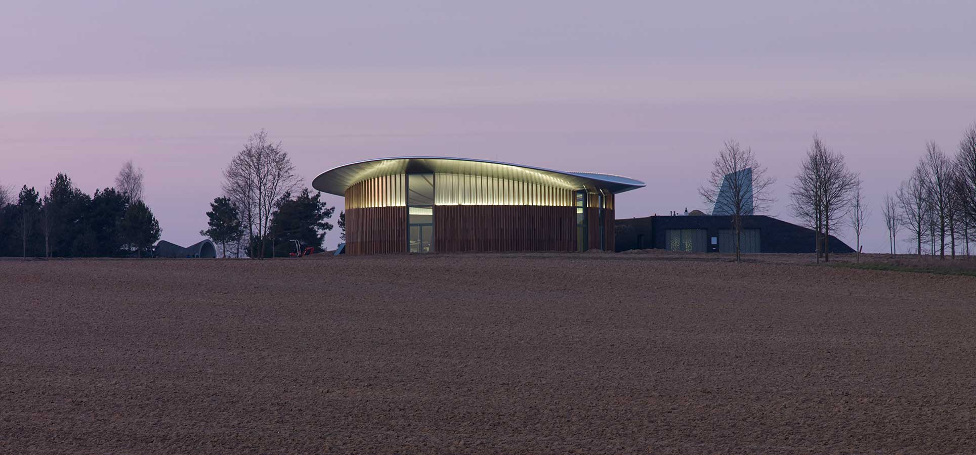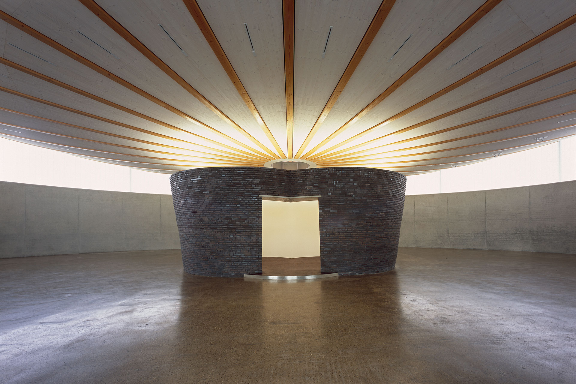 Für die ellipsenförmige Ausstellungshalle hat Transsolar ein besonders suffizientes Klima- und Lüftungskonzept entwickelt. Ziel war der völlige Verzicht auf einen EnEV-Nachweis im Rahmen der Baugenehmigung. Insofern liegt die Raumzieltemperatur in der Ausstellungsfläche für die Heizperiode bei gerade mal 12°C. Als Heizsystem ist in den massiven Boden lediglich eine wasserbasierte Flächenheizung integriert. Für die Be- und Entlüftung sind motorisch geregelte Klappen in der Fassade und im Dach vorgesehen. Darüber hinaus gibt es dezentrale mobile Ultraschall-Befeuchtungsstationen, die im Winter auf eine Luftfeuchte von 50 – 55 % r.F. befeuchten, sollten im Fall einer Veranstaltung temporär Raumtemperaturen von 20°C gewünscht sein. Auf eine Kühlung, Entfeuchtung oder mechanische Lüftung wurde gänzlich verzichtet. Trotzdem soll die Ausstellungshalle idealerweise in einem konstanten Feuchterahmen von 50 – 60 % r.F. und in einem Temperaturband von 12 – 28°C gehalten werden. Erreicht wird dies durch ausreichend thermische Masse, sommerliche Nachtauskühlung und eine bedarfsgerecht geregelte, natürliche Lüftung. Raumtemperatur, Luftfeuchte und CO2-Gehalt der Luft werden sensorisch erfasst und durch die Gebäudeautomation in Regelalgorithmen für Lüftungsklappen, Heizsystem und Luftbefeuchter umgesetzt. Bedingt durch den weitestgehend natürlichen Klimatisierungsansatz sind temporäre Unter- oder Überschreitungen der Raumklimakorridore jedoch zu tolerieren.
