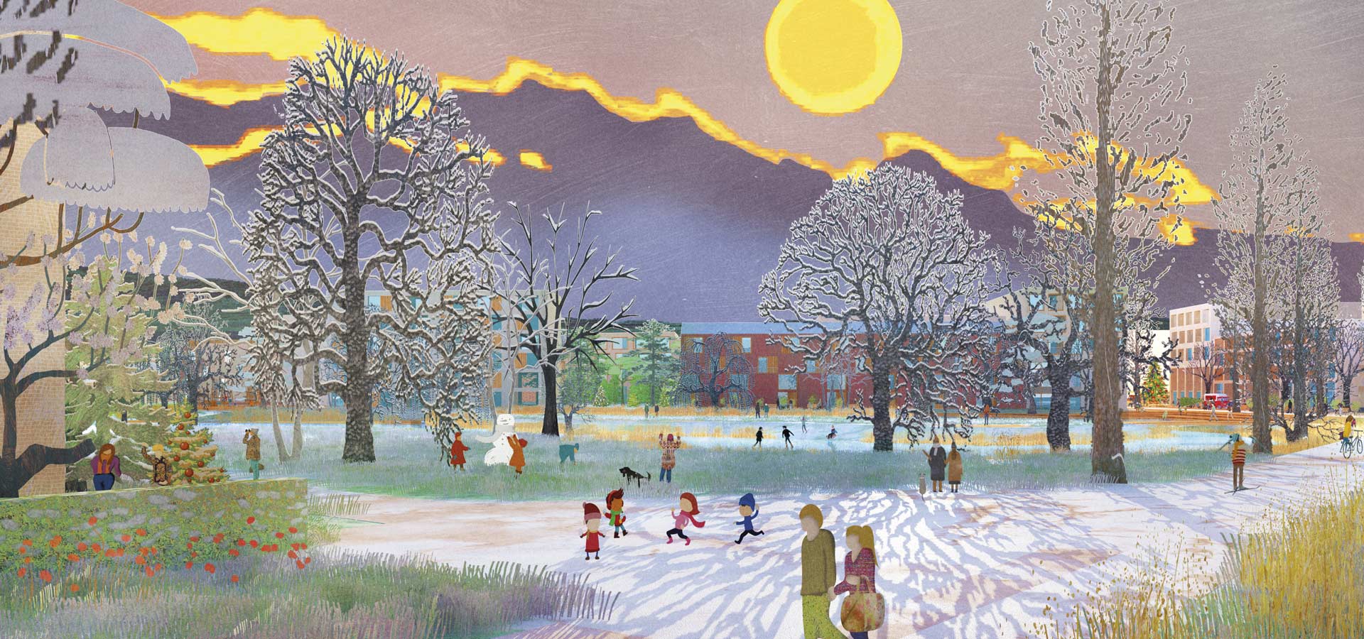 After completion, the annual electricity generation of the entire quarter will be in total around 17,600 MWh, by about 142,000 m² photovoltaics on the roofs and south-facing facades. In addition, 33,000 m² of the solar thermal system provides energy buffered in the seasonal heat storages. In each of the four district sections an energy centre will be well integrated into the landscape architecture in a socalled neighbourhood garage. And alos power storage units shall be integrated there. Each part of the quarter will get with this its own "energy heart". This approach to a synergetic and integral concept, combined with the optimised design of buildings and roofs, not only gives the neighbourhood way to run "CO2-negative", but also makes it green and worth to live in.