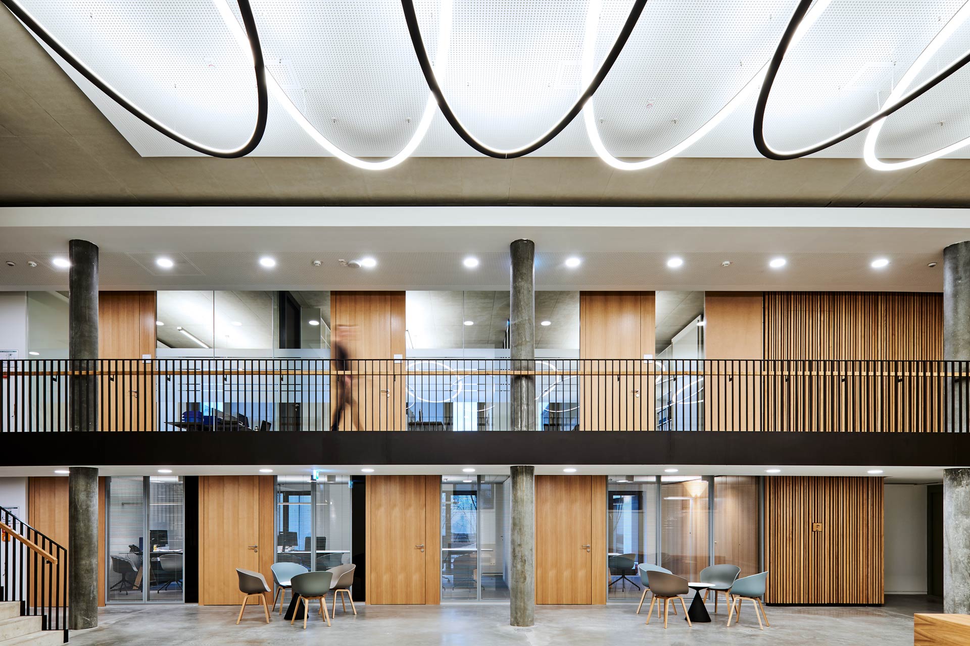 The façade concept reduces transmission heat losses. Solar gains and daylight availability are optimized wherever possible. During the summer, thermal insulation is ensured by external movable sun protection devices. In many areas, the building is naturally ventilated. Heating and cooling are mainly carried out via component activation, which forms the basis for a highly efficient heating and cooling supply.