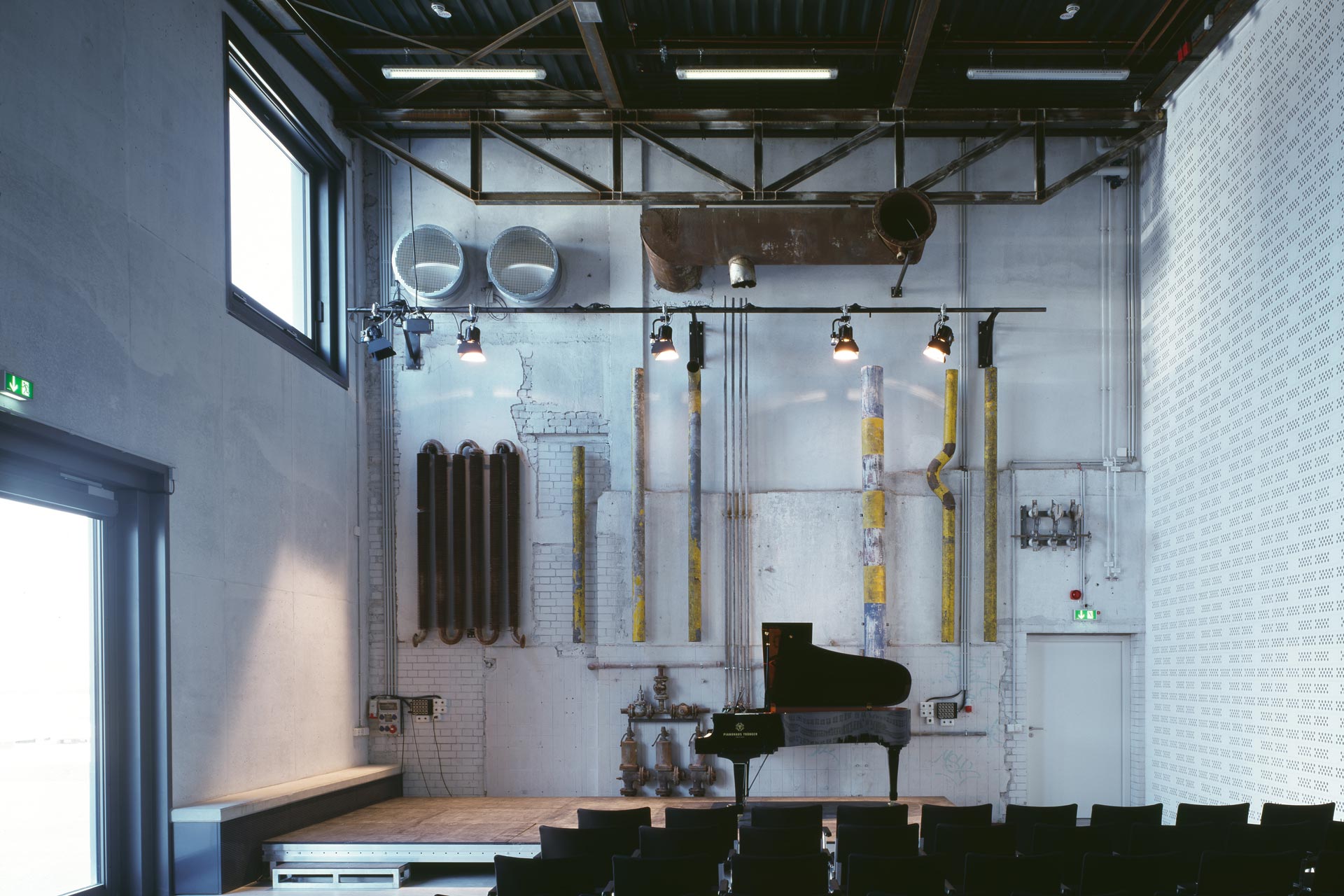 Adjacent to the converted factory building, a new building was constructed for the local music school with classrooms and rehearsal rooms, a dance and movement room and a cafeteria in the foyer.