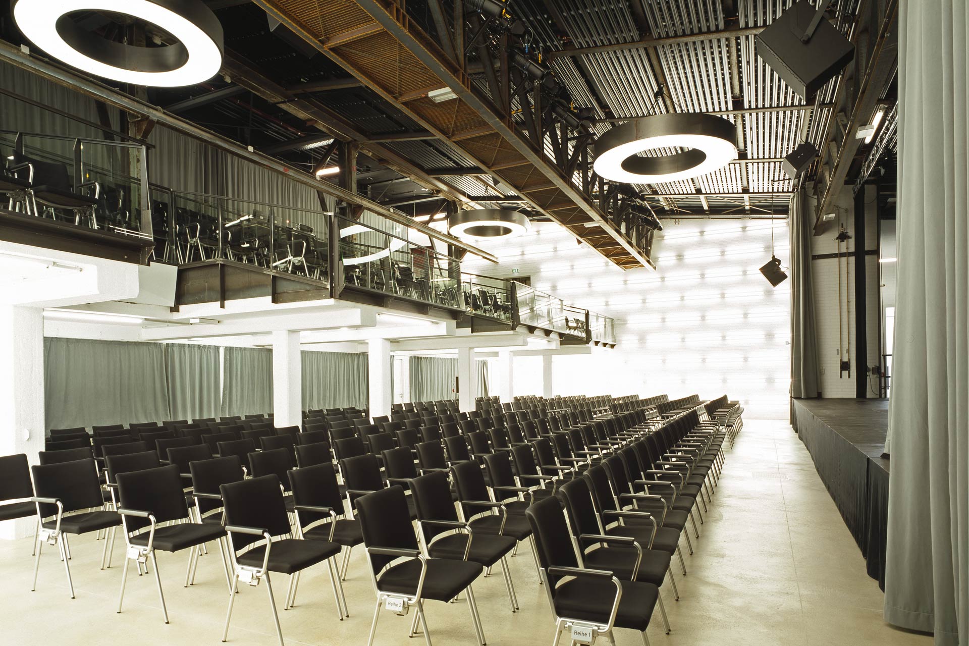 Norderstedt's climate offers very good conditions for natural ventilation. An existing creep cellar, converted into an earth channel register, now conditions the supply air, which enters the two event halls through displacement air outlets in the grandstands, benches and stage area. A 20 m high exhaust chimney generates the drive for this. The natural ventilation is only mechanically supported when there is no wind and high outside temperatures. A radiative ceiling heating system heats the rooms in winter and cools them in summer by operating them with groundwater from a well.