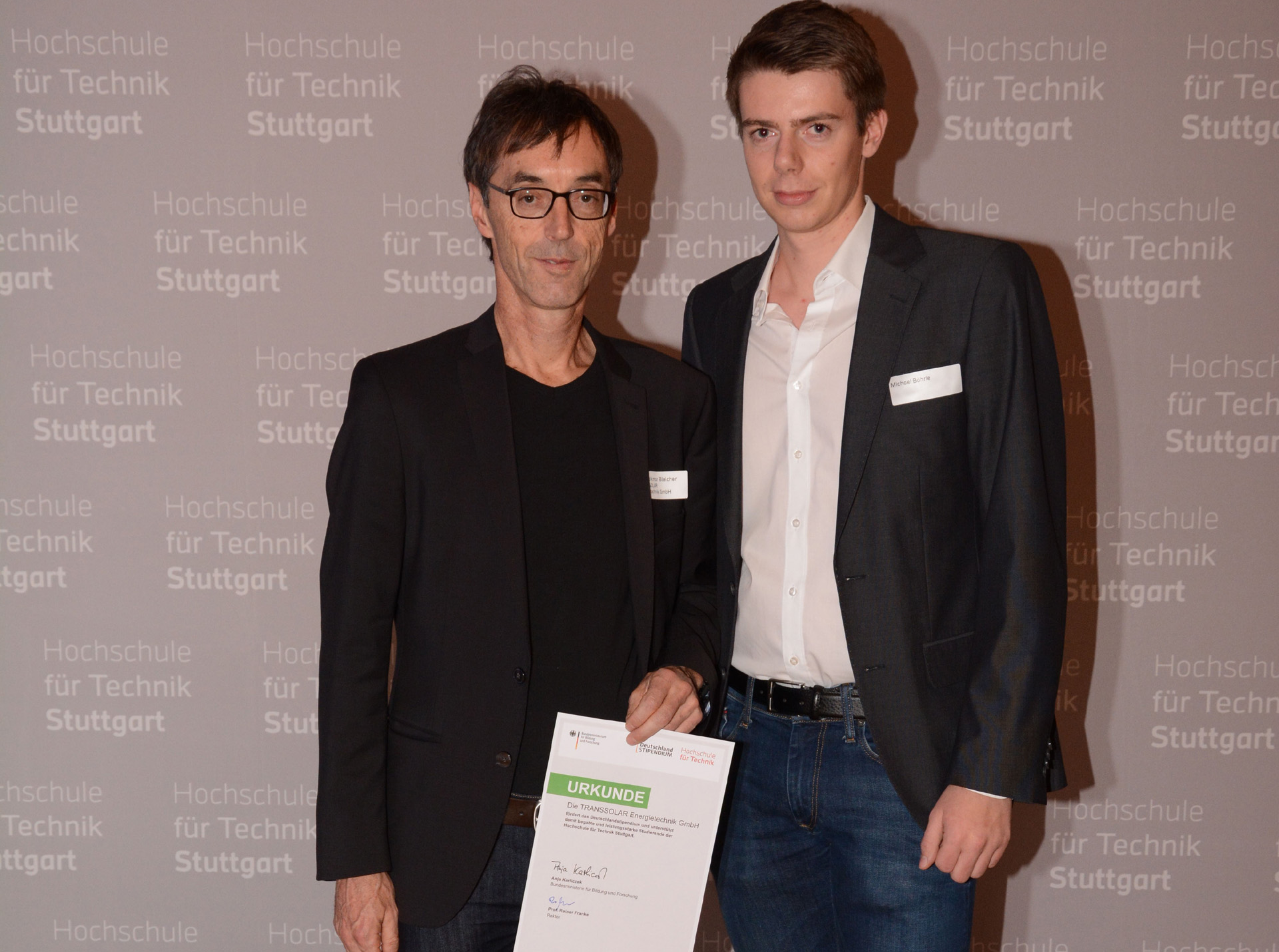 Links im Bild von der Stipendiatenfeier Volkmar Bleicher, Professor an der HFT, rechts der erfolgreiche Bewerber Michael Bährle.