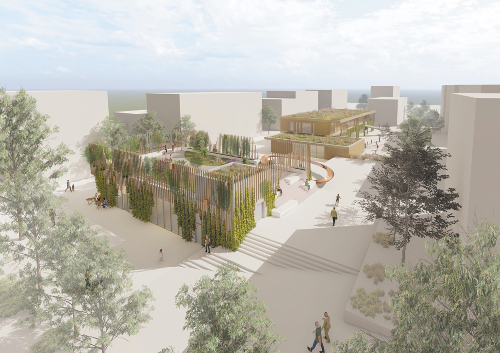 Der Entwurf von UTA Architekten und Stadtplaner GmbH (Stuttgart) mit Koeber Landschaftsarchitektur GmbH (Stuttgart), Bureau Baubotanik, Transsolar KlimaEngineering und Ohlf Schoch Architekten überzeugte die neunköpfige Jury unter dem Vorsitz von Prof. Jens Wittfoht: Sie wählte das moderne Konzept einstimmig zum Sieger. Der Entwurf sieht sowohl für die Kita als auch für die Begegnungsstätte eine begrünte Fassade und ein begrüntes Dach vor, wodurch eine starke Verbindung zwischen den umliegenden Wohngebäuden und der zentralen Grünfläche entsteht. Eine über zwei Geschosse vorgesetzte Fassadenkonstruktion an der Begegnungsstätte dient als Rankhilfe und bildet so ein offenes „grünes Zimmer“ auf dem Dach des Gebäudes, das als Stadtteilterrasse von allen Anwohner*innen des Quartiers genutzt werden kann – Spielmöglichkeiten für Kinder inklusive. Zwischen den Gebäuden werden überwiegend grün angelegte Flächen gestaltet werden. Das Kita-Gebäude setzt sich aus einem eingeschossigen und einem zweigeschossigen Bauteil zusammen, in der sechs Gruppen Platz finden sollen. Ein großzügiger Außenbereich mit unterschiedlichen Spielbereichen schließt sich an der Südseite des Gebäudes an. Beide Häuser sollen vorzugsweise aus Recyclingbeton errichtet werden.