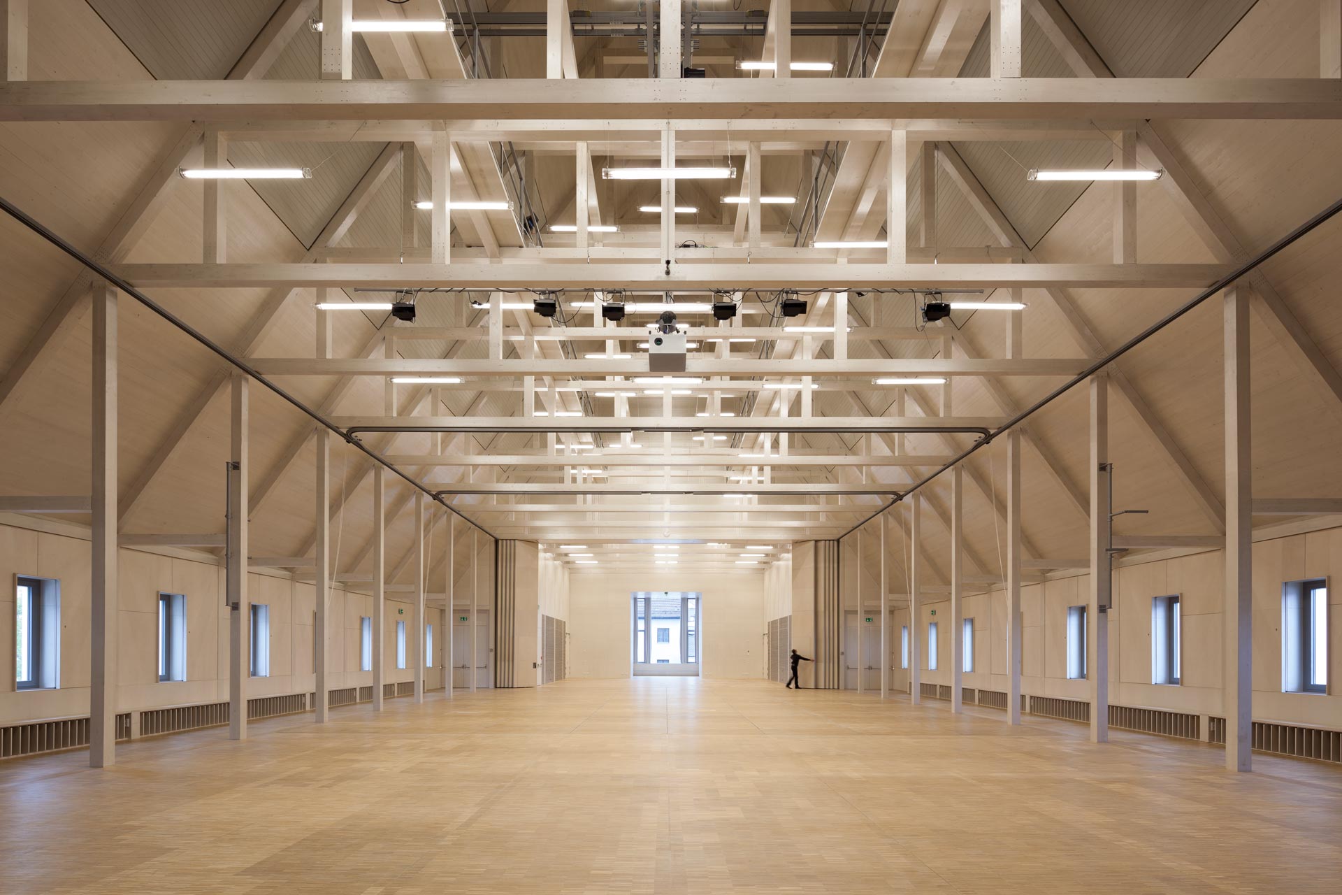 The new building has a high-quality thermal insulation of the airtight thermal building envelope and mechanical ventilation systems with heat recovery. Most rooms are equipped with active floor slabs for heating and cooling, in the Raiffeisen hall an additional cooling / heating ceiling is provided. The supply air for the Raiffeisen hall is provided as displacement souce air and flows laterally from the benches and the front of the stepped electric stage lifts. Unlike mixed air systems this setup directly provides fresh air for up to 800 people and fully exploits the cooling potential of the temperature-controlled and (partially) dehumidified supply air (cooled down to 18° C).