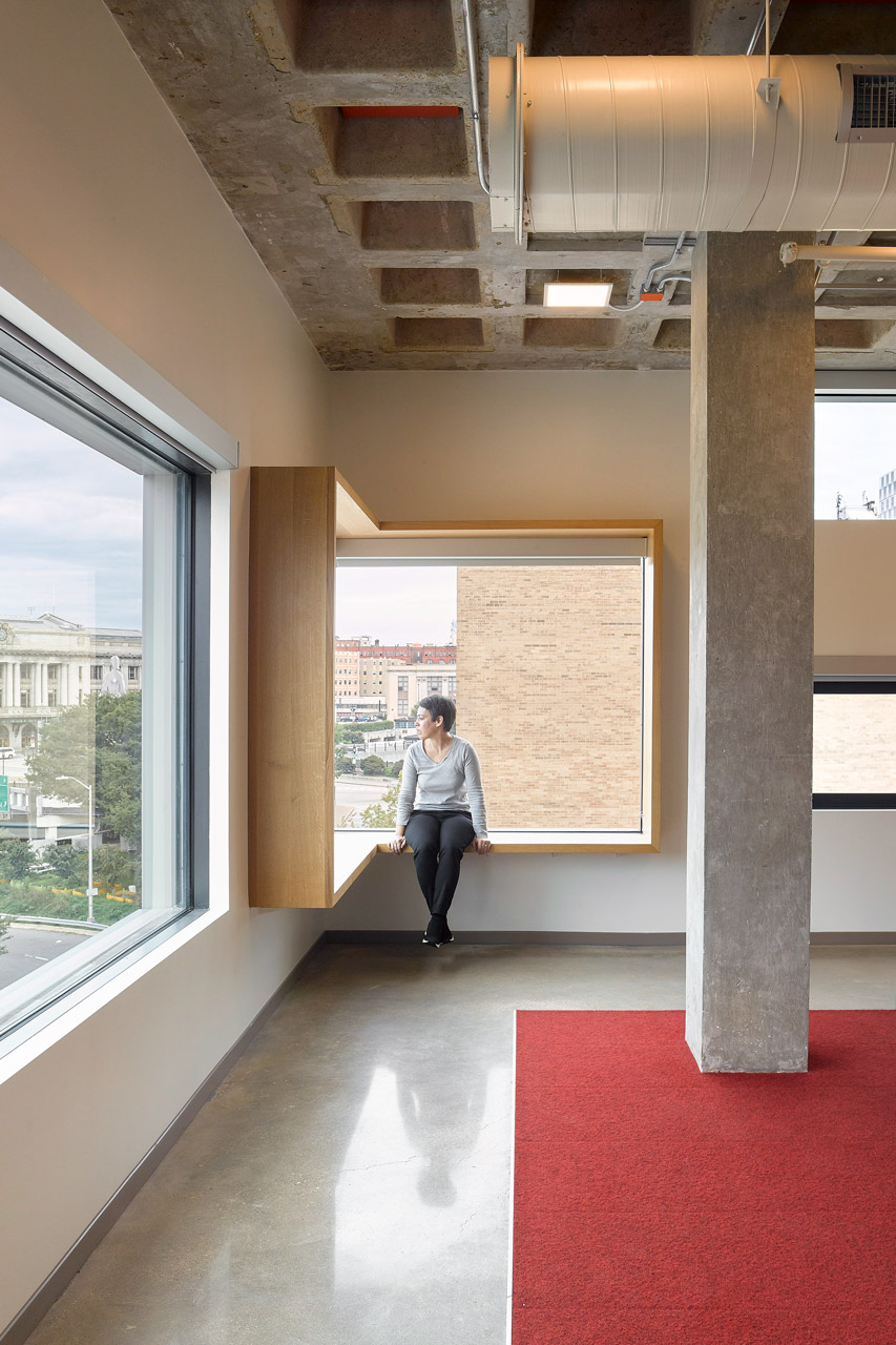A striking addition of a glass hall on the west façade connects the four levels, providing a contemporary academic and public space to the building. In addition to promoting interior circulation, the glass hall provides daylight, views and natural ventilation to the original floor plate. Transsolar performed extensive thermal studies to detail the interior operable roller shading, including the specifications for materials, openness factor, location and functionality to provide optimum solar control and exhaust the heat built up in the glass hall.