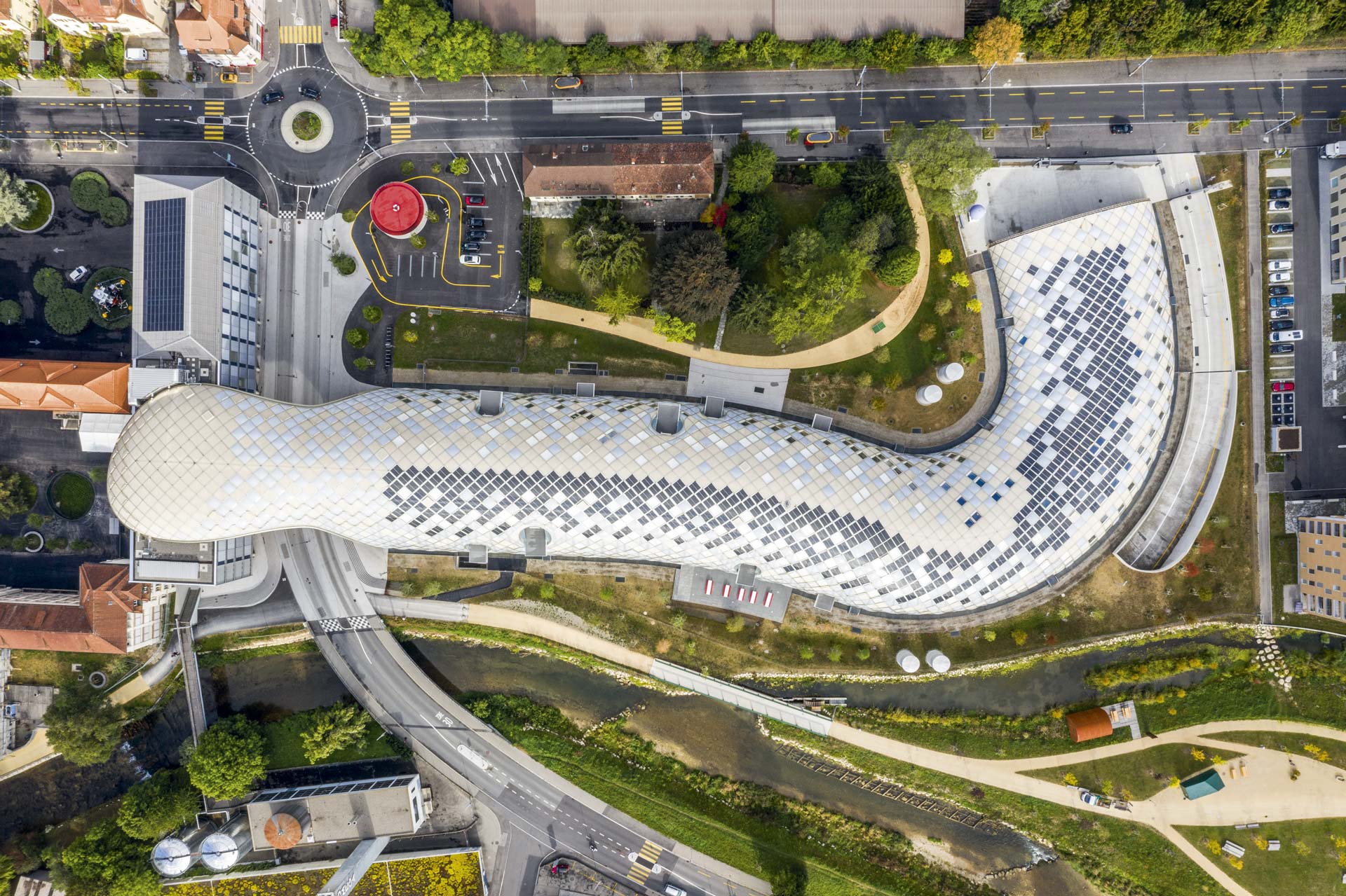 The new office wing with its winding dragon's body seems to reach across the street for the neighboring museum; 240 m / 787 ft long, 35 m / 115 ft wide and 27 m / 88,5 ft high above the street. A bridge on the third floor connects the office building with the "Cité du Temps" across the street. The grid roof construction consists of 4,600 individual wooden elements. Manufactured with high precision, the parts fit into each other. The building concept is geared to the comfort of the employees and increases well-being and productivity: acoustic elements are inserted into the concrete ceilings and a concrete core activation system provides thermal comfort. The mechanical basic ventilation covers the minimum hygienic requirements, the supply air enters the building according to the displacement principle, thus minimizing the risk of draughts and ensuring high ventilation efficiency. There are also operable windows. Three different construction elements form the facade shell of around 11,000 m² / 118,403 ft²: firstly, there are glass elements, in which triple glazing keeps thermal losses low, with shadings on the outside for best sun protection efficiency; it is covered by a glass pane that protects the shading (closed cavity). Then there are translucent elements with low U-values made of a membrane construction with a special interlayer that allow diffuse light to enter the interior. Thirdly, there are closed elements with the lowest U-value, which are covered with PV where they are horizontally or facing south. The arrangement and proportional distribution of the elements was optimized according to the view (only through the glazed elements), daylight distribution in the room, overall U-value and best energy gains for PV.