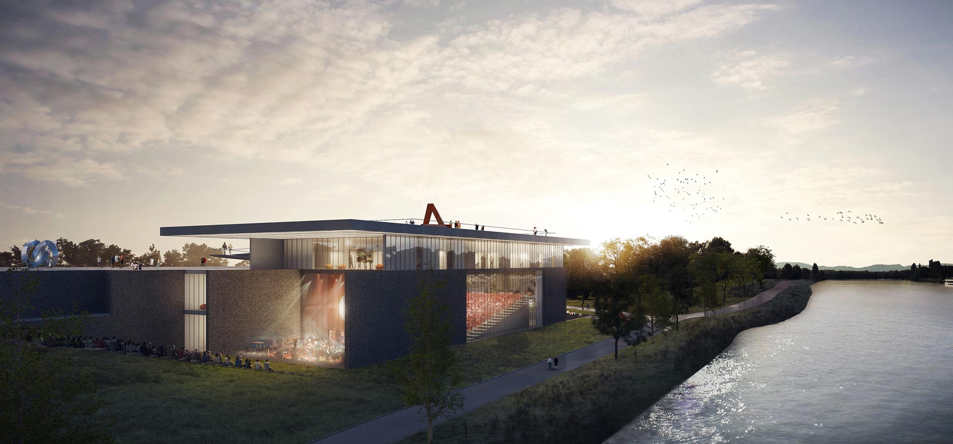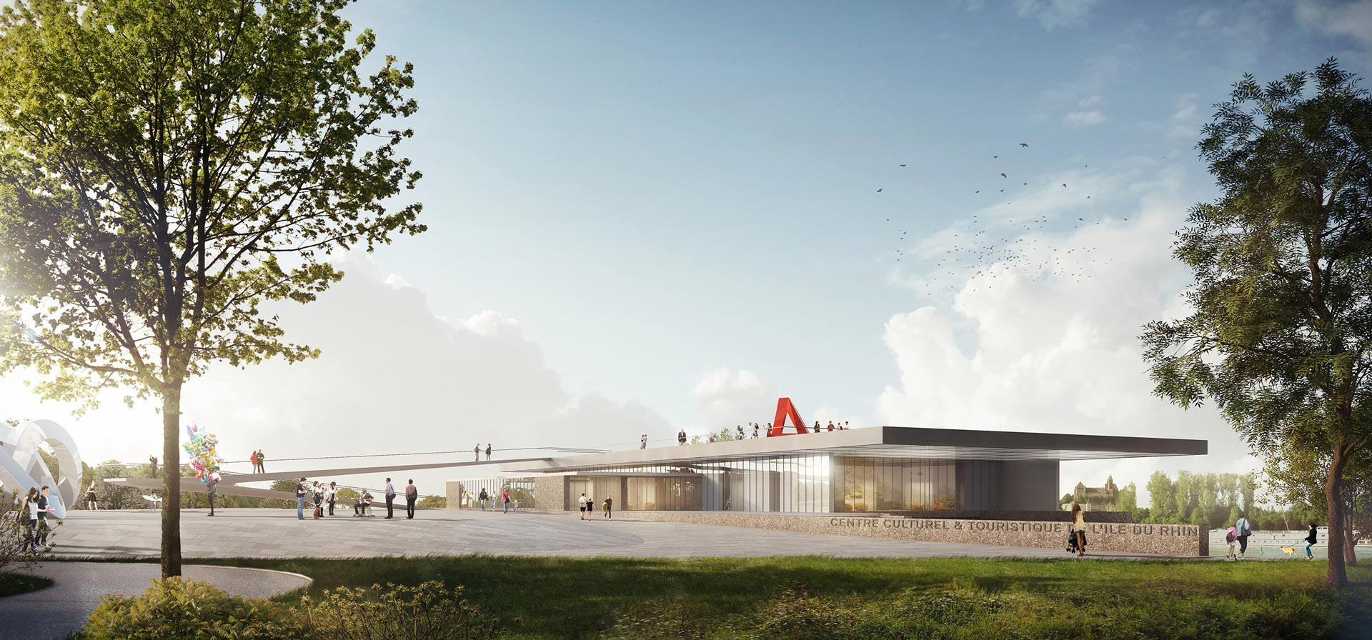 Vogelgrun is a French town located on the French-German border, and home to a new cultural centre. The centre, located on an island, possesses an architecture that takes advantage of the site’s geographical features: The large hall for 400 visitors is located close to the riverbank, and offers views to the Rhine and the rocks of Brisach on the opposite bank. In addition to the multi-purpose hall, there is a tourist office, a French-German cultural centre, a forecourt and an observation deck, which offers impressive views towards the two neighbouring towns and their surroundings. On the other hand, since the building is visible from afar, special care was taken with its form.
