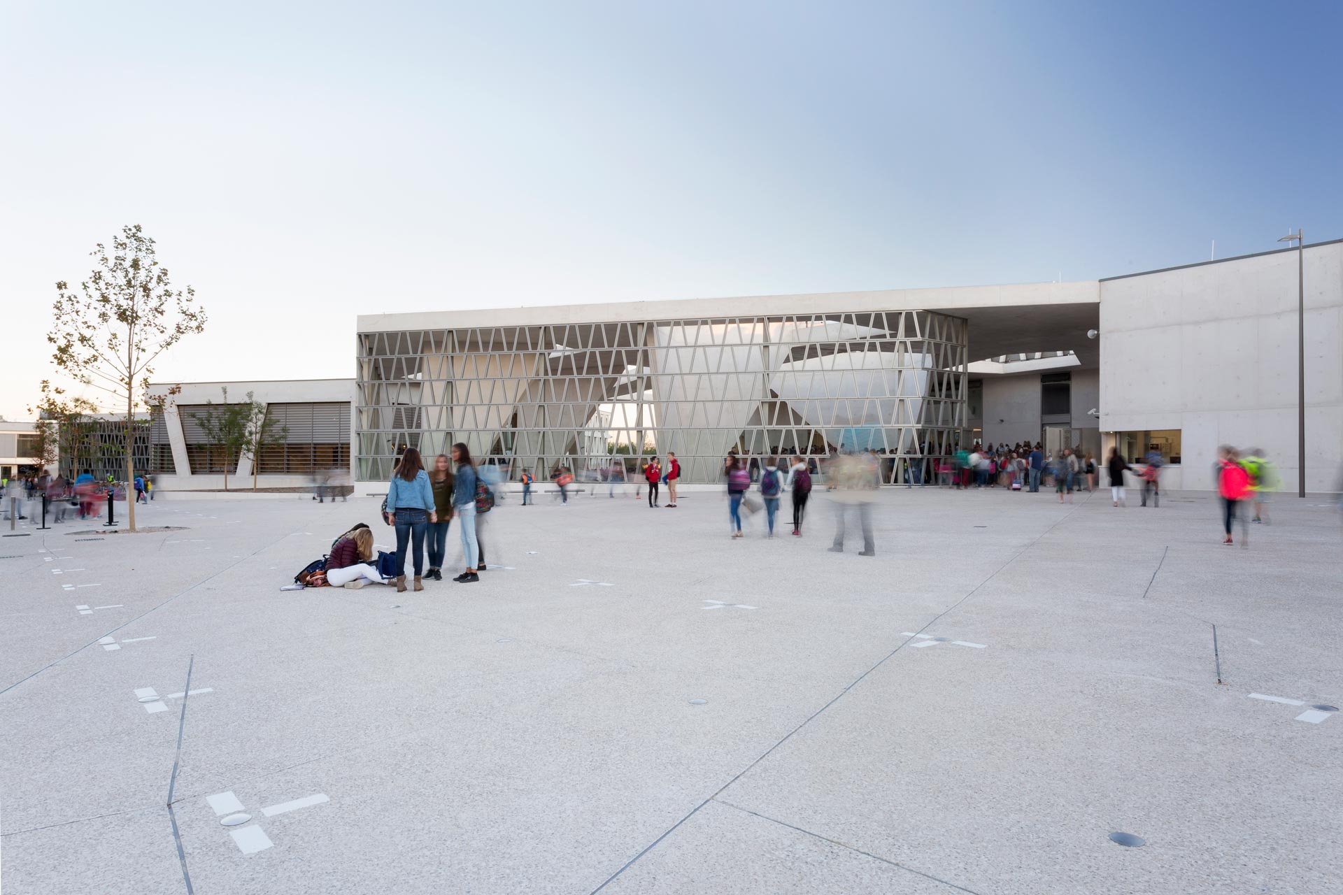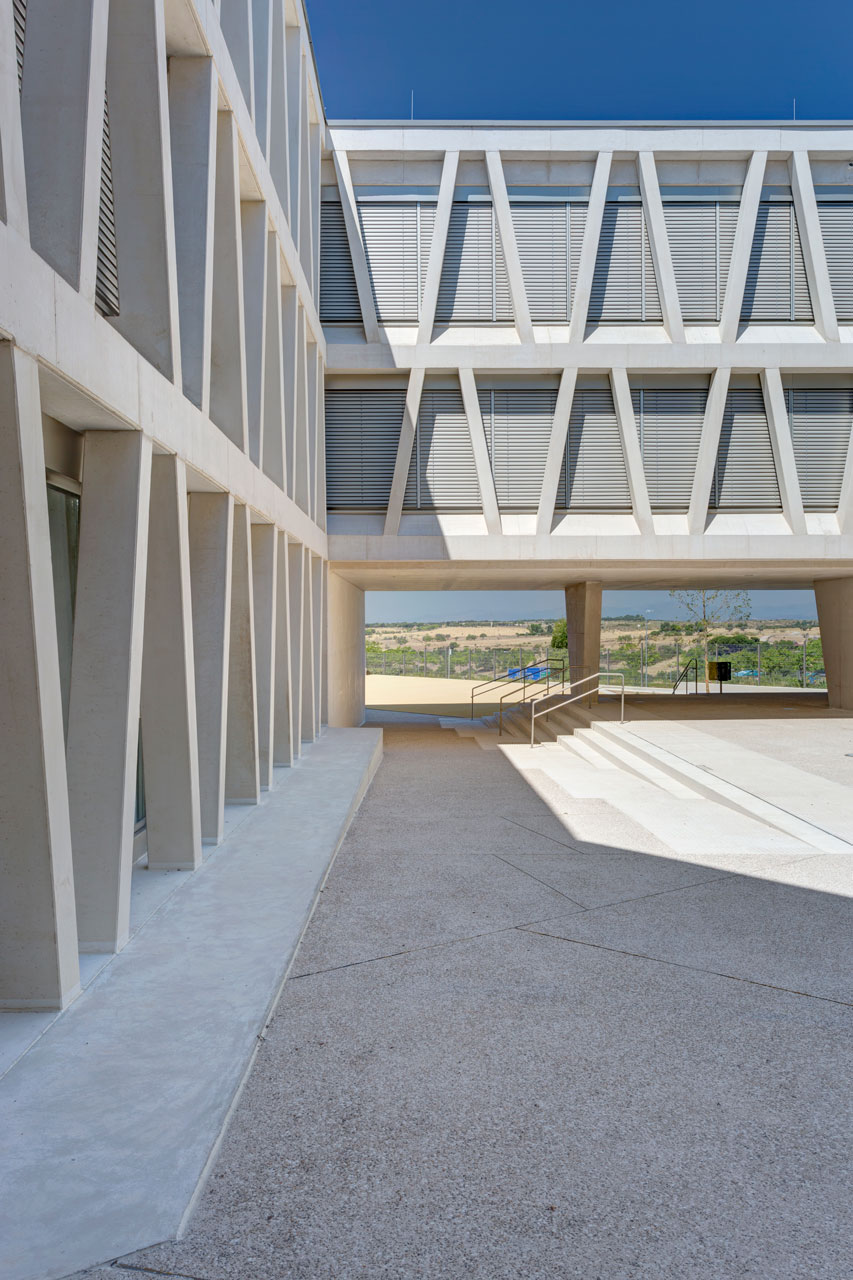The programming of the German School Madrid includes a kindergarten, a primary and secondary school, a canteen, an auditorium and a gymnasium. The individual buildings are connected by courtyards, which are partly covered to provide shaded lounge areas for breaks.