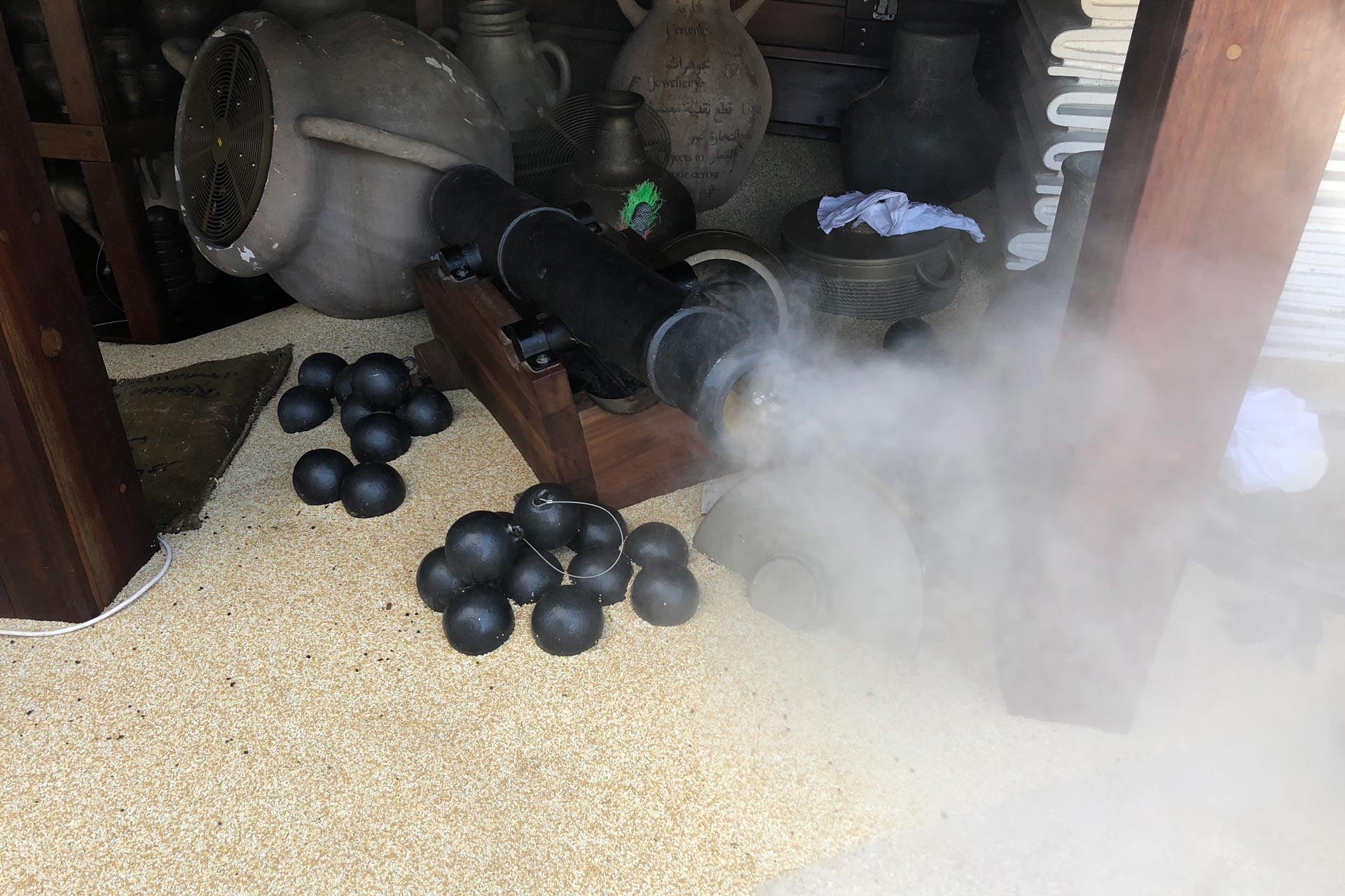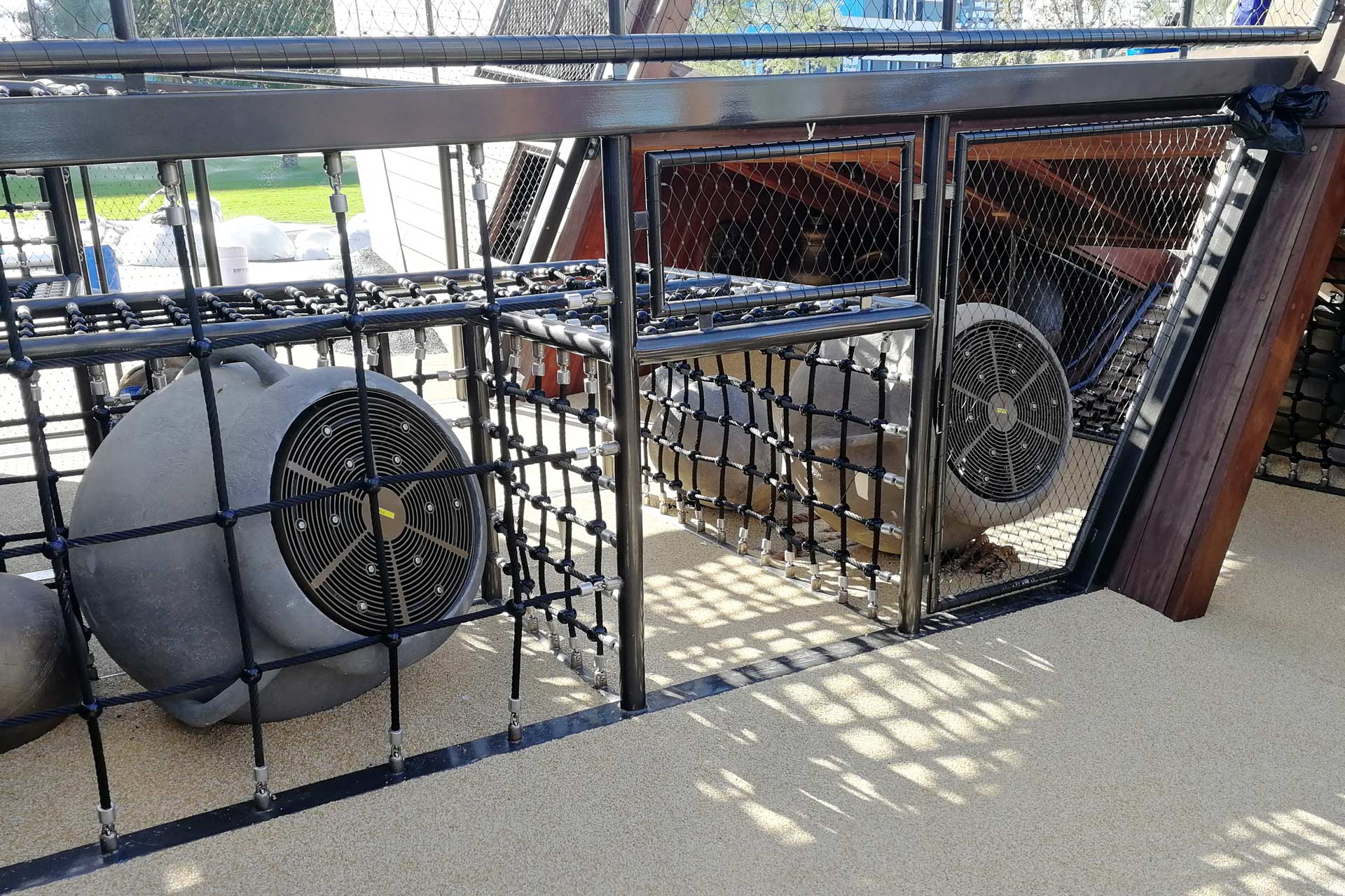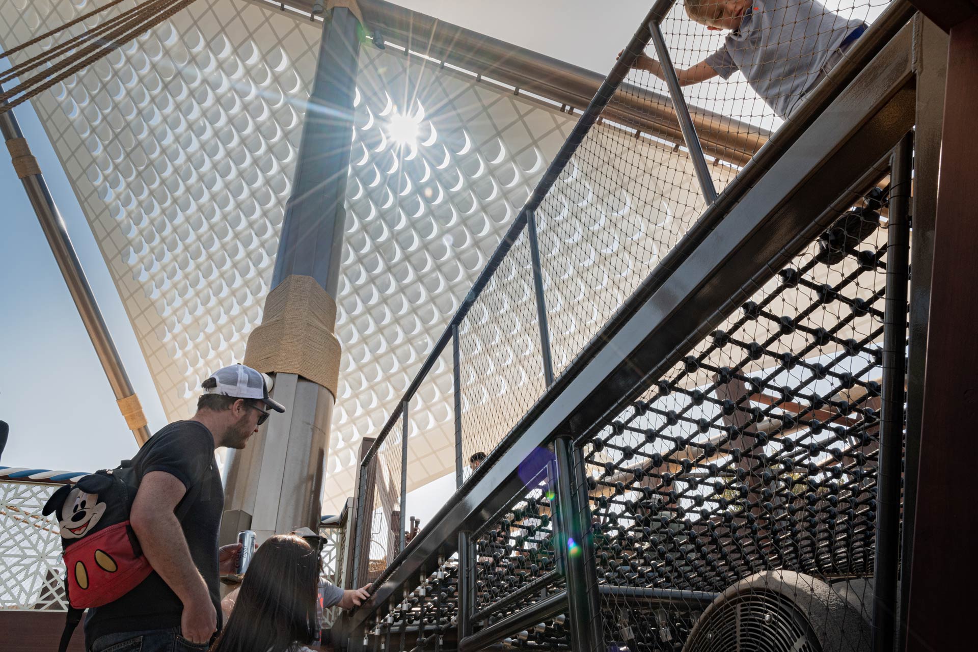 The 'Cave of Wonders' creates the impression of a cool cave and is tempered by radiant cooling mats and an air conditioning system. For the outdoor areas around and on the 'Adventure Ship', the entire bag of tricks of outdoor comfort measures was used. These range from strategic choice of materials for the surfaces to efficient shading systems and the use of specially developed and optimized evaporation cooling systems. In order to prevent excessive heating of the surfaces, light-colored materials were chosen as far as possible, which reflect a large part of the solar radiation and therefore heat up less than dark surfaces.