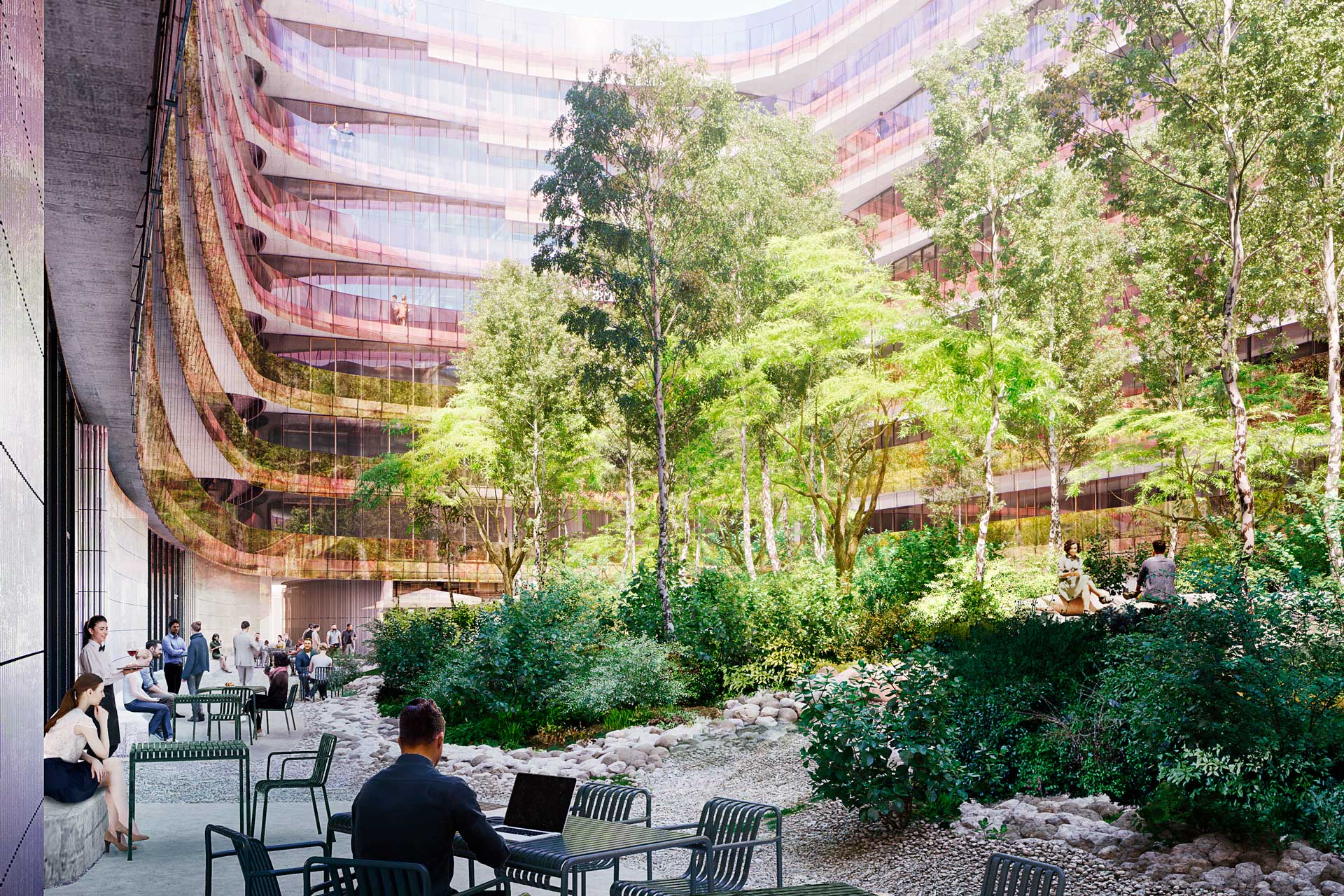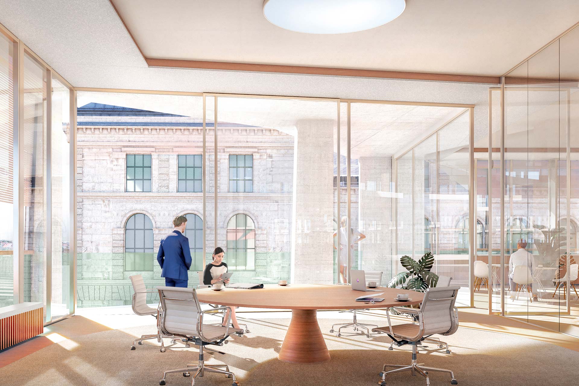 Not far from Munich Central Station, Herzog & de Meuron are transforming the former Postbank square into an energy-efficient complex. The complex from the 1990th will not be demolished completely, since the body framing is still in good condition and should mostly be preserved. The building will form a coherent ring with subdivisible office spaces and, with new facades, and will act as a centre of attraction for mixed use in the inner city. The courtyard will be transformed into a green garden acting as a purifying element; filtering the air in a natural way.