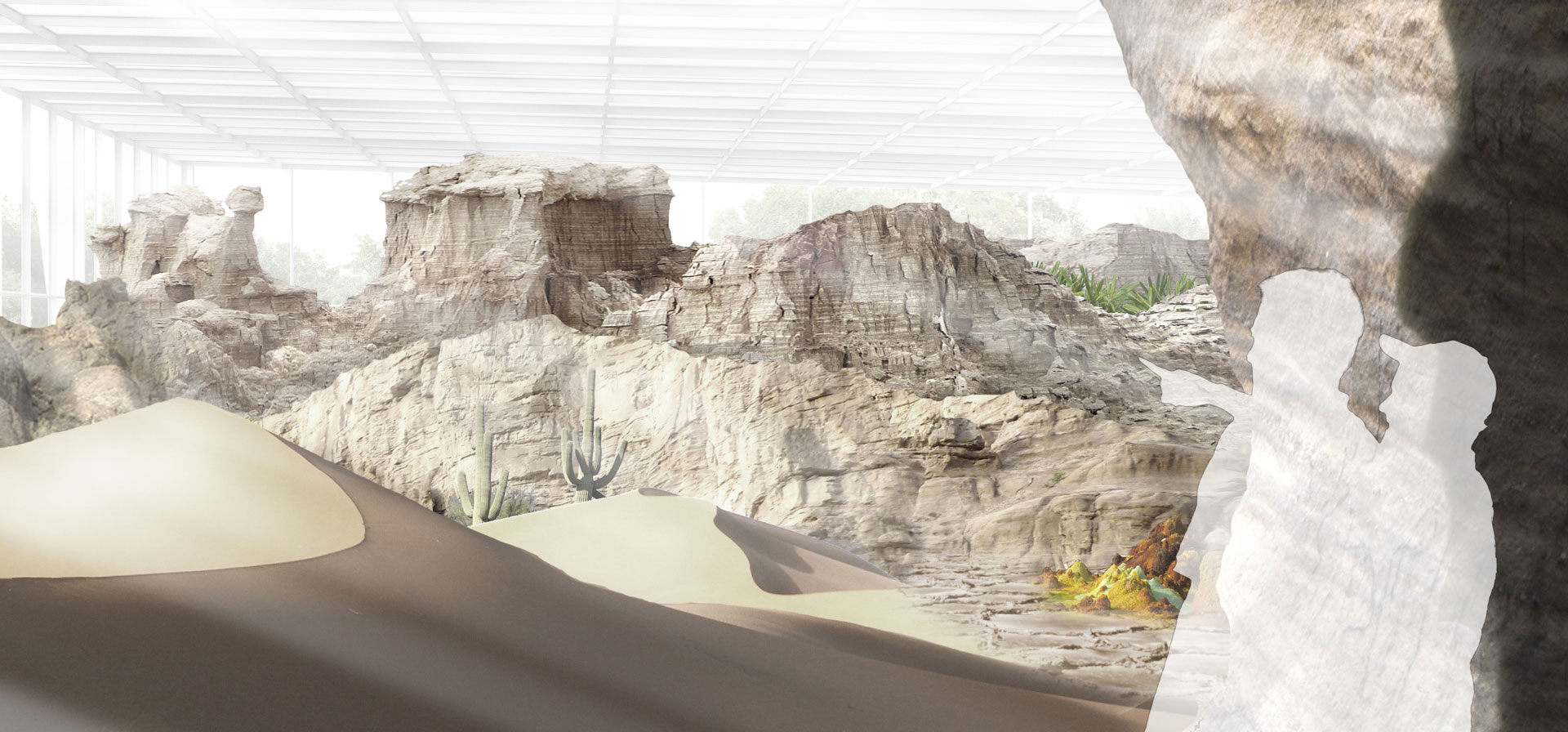 Besides event and gastronomy rooms, the main components of the project are separate desert and jungle houses. Here, the habitats with their specific flora and fauna will not only be presented but can be experienced.