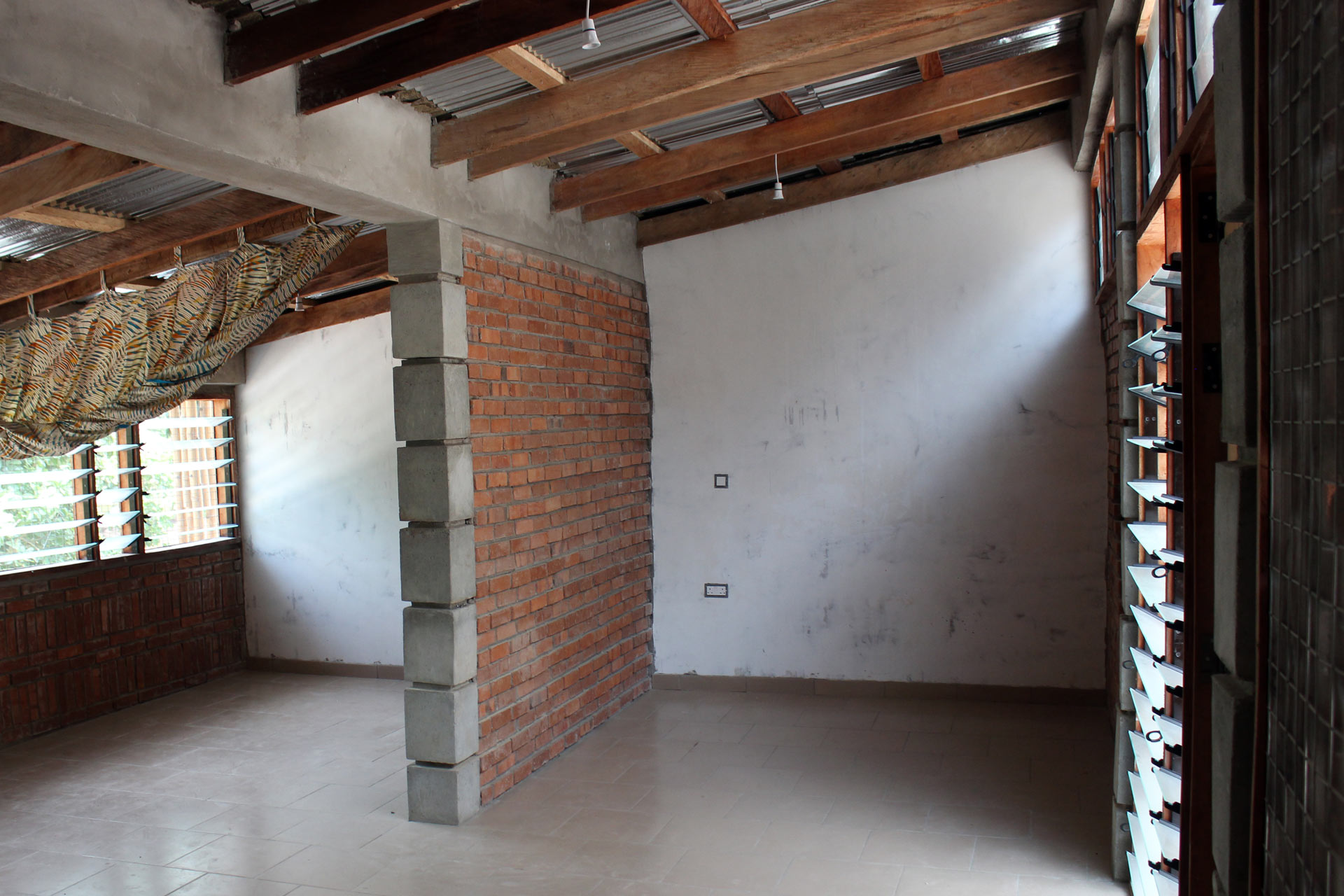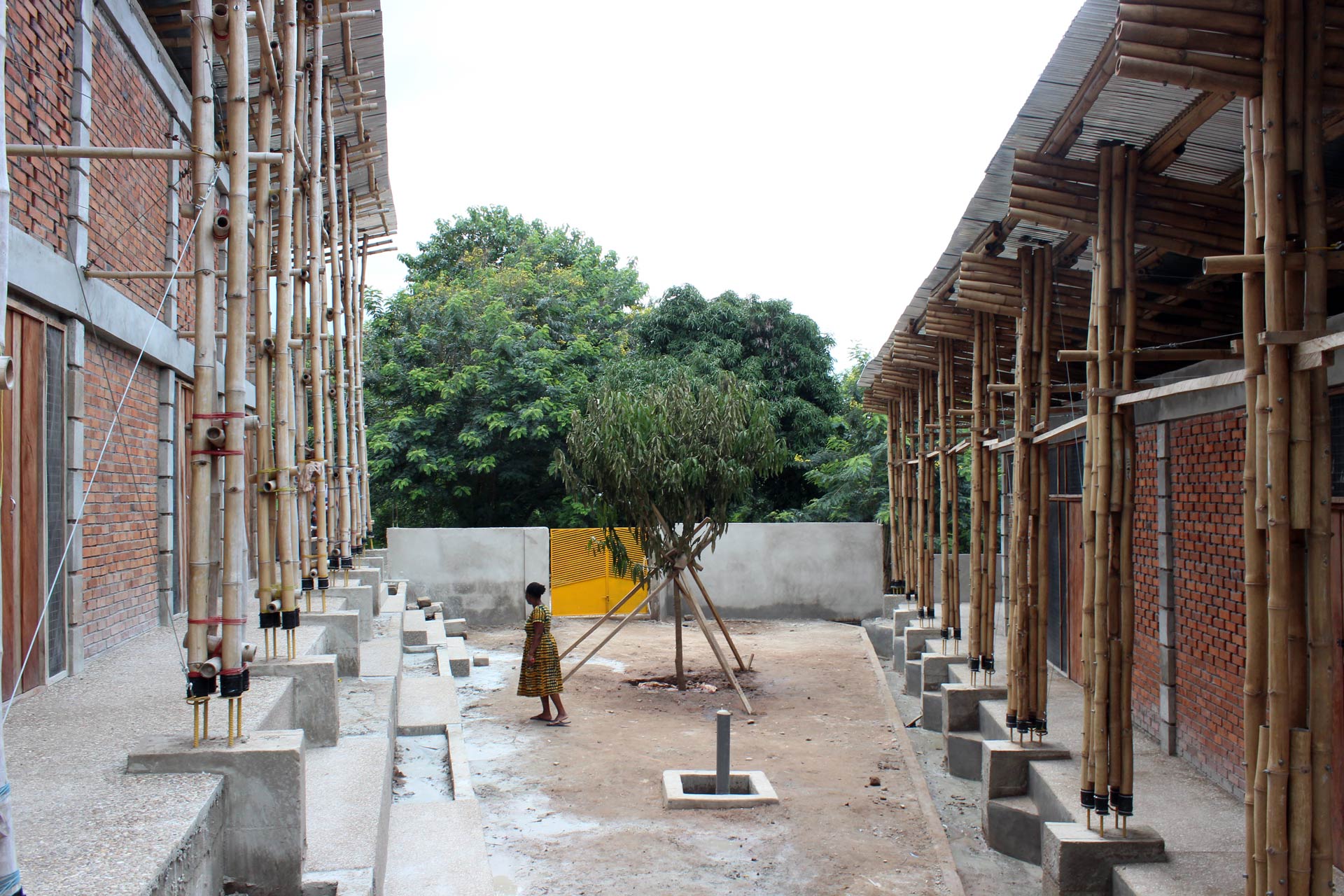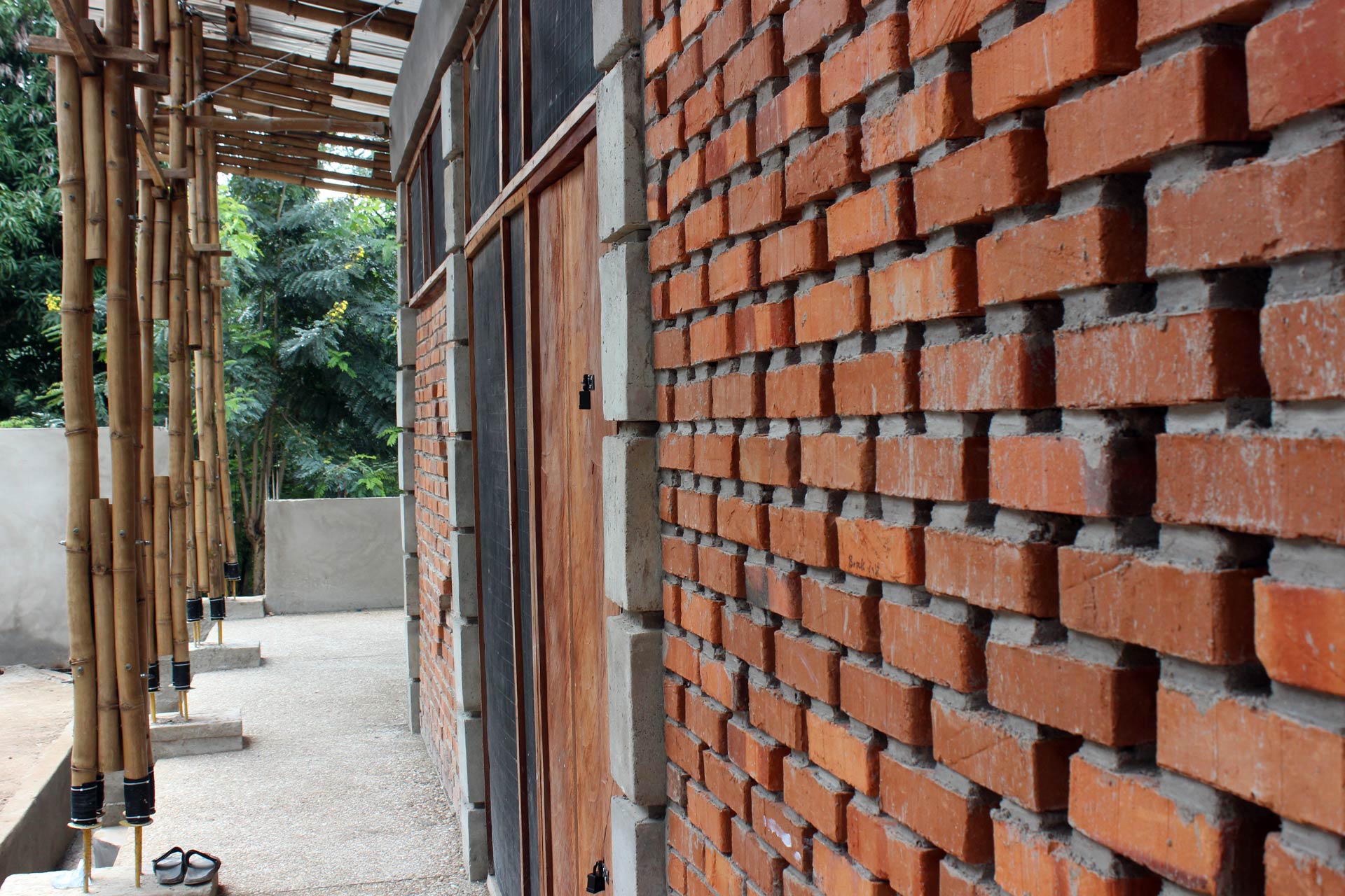 Allowing air movement is a suitable strategy that gives relief from heat and humidity. Therefore, the buildings are two-stories high and furnished with generous ventilation openings. The main wind direction in Havé is north-south. Therefore, it was important to arrange the buildings east -west, with a courtyard ventilated by the wind. Wind flow is especially important at night, when the cooler air can be used flush heat from the thermal mass, Mudbricks, made in-house, bricks from a local company, and some concrete make up the thermal mass in this building.