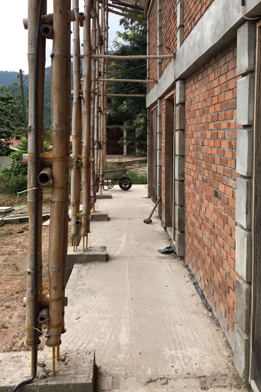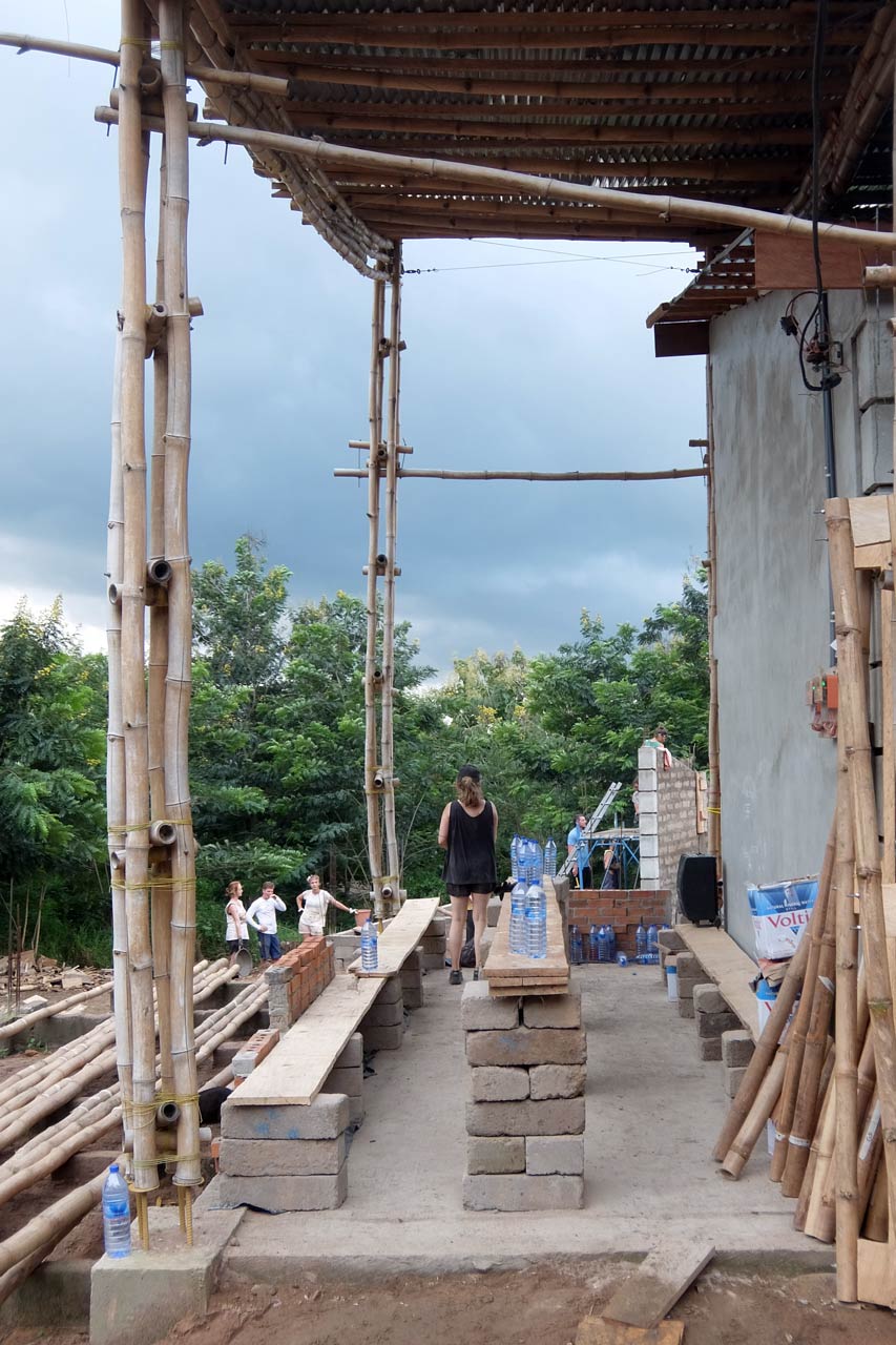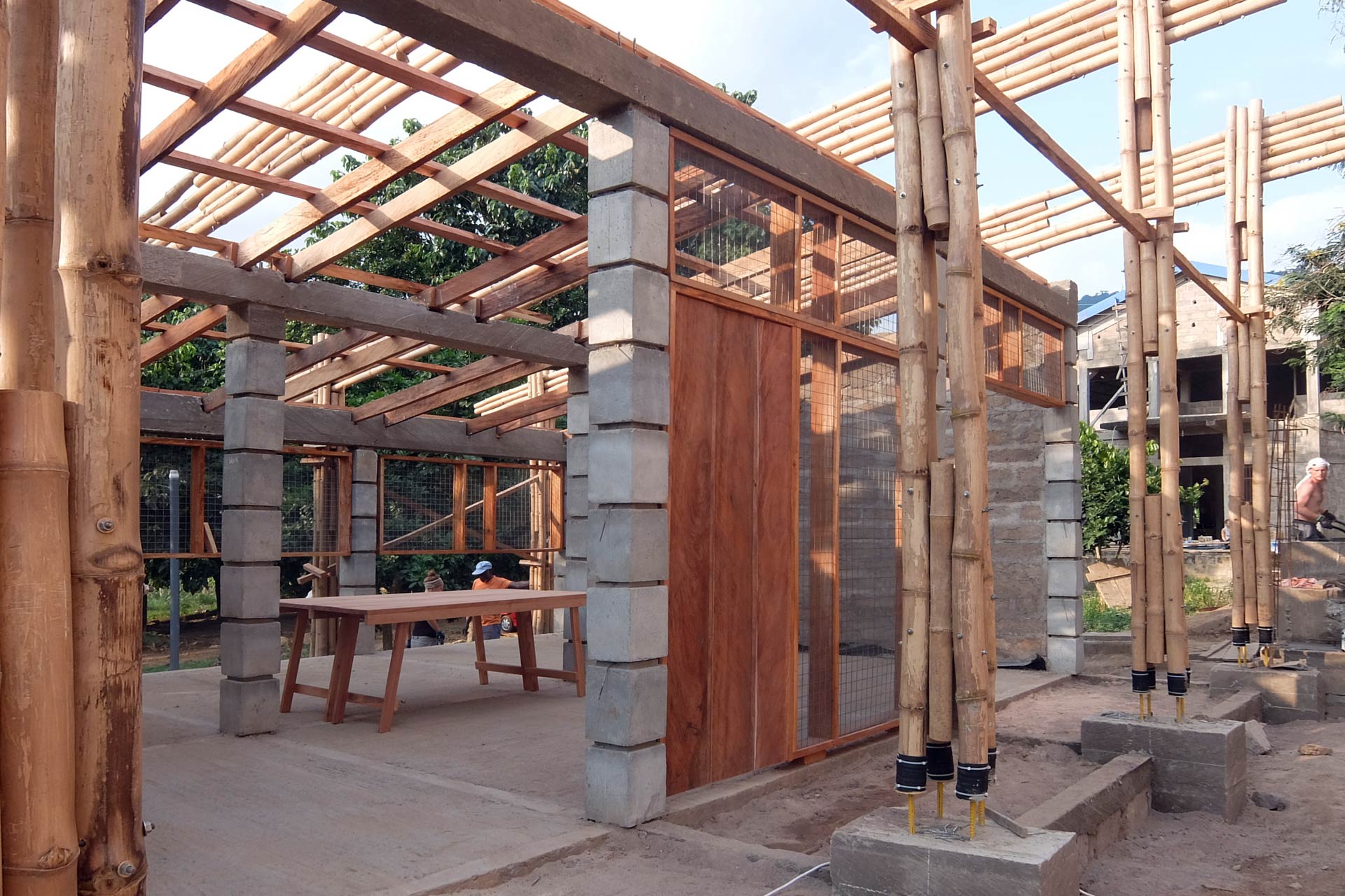 Allowing air movement is a suitable strategy that gives relief from heat and humidity. Therefore, the buildings are two-stories high and furnished with generous ventilation openings. The main wind direction in Havé is north-south. Therefore, it was important to arrange the buildings east -west, with a courtyard ventilated by the wind. Wind flow is especially important at night, when the cooler air can be used flush heat from the thermal mass, Mudbricks, made in-house, bricks from a local company, and some concrete make up the thermal mass in this building.