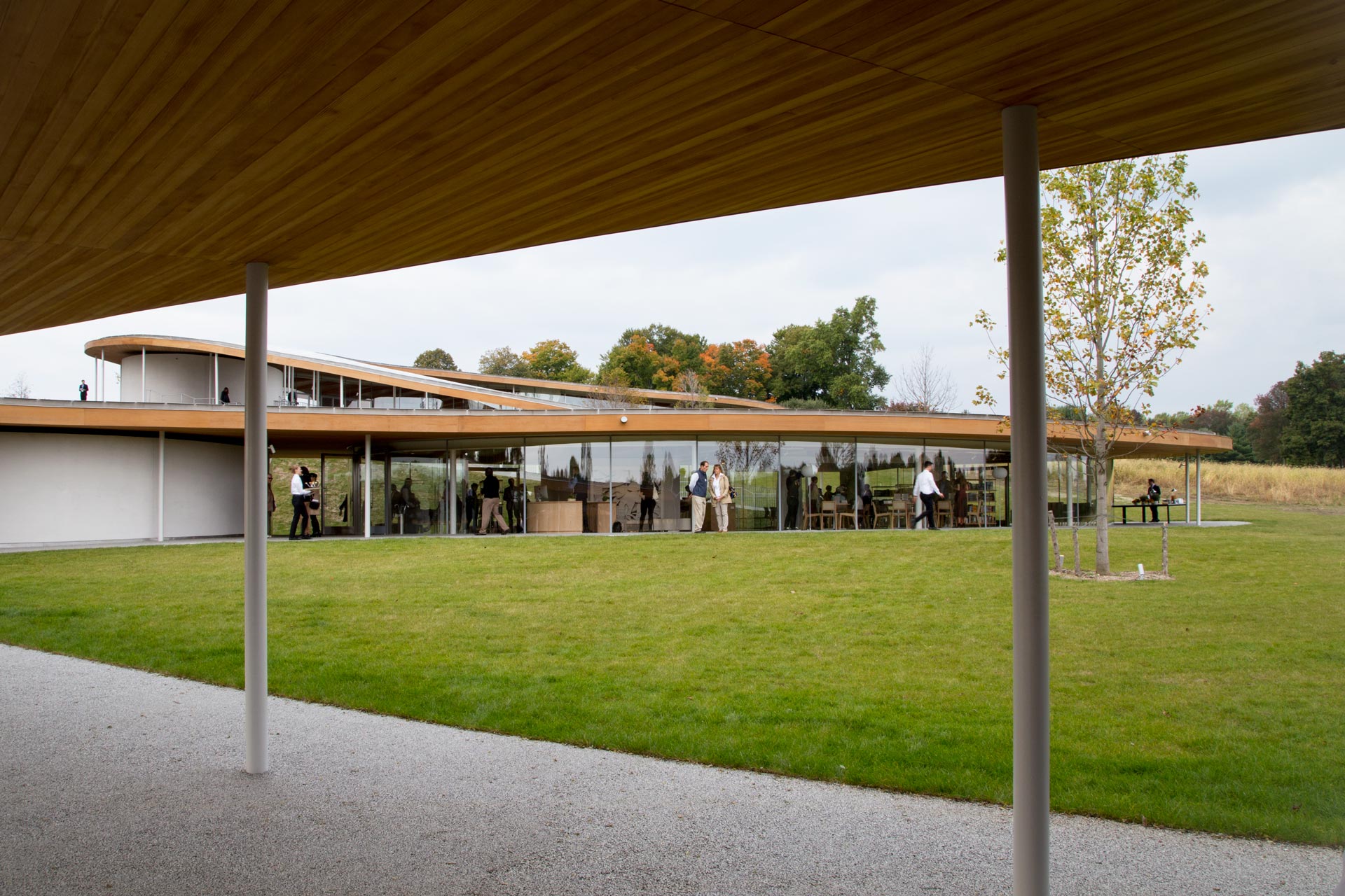 Nestled amid 75 acres of meadows, woods, wetlands and lakes, the River building begins on a knoll and meanders down in a series of bends, forming pond-like spaces. The building of glass, concrete, steel and wood possesses a single long roof, which appears to float above the ground as it twists and turns across the landscape. The walkways, courtyards and volumes wrapped in glass that form beneath the roof are remarkably transparent, inviting people to engage with the expansive natural surroundings which are being preserved by the not-for-profit Grace Farms Foundation.