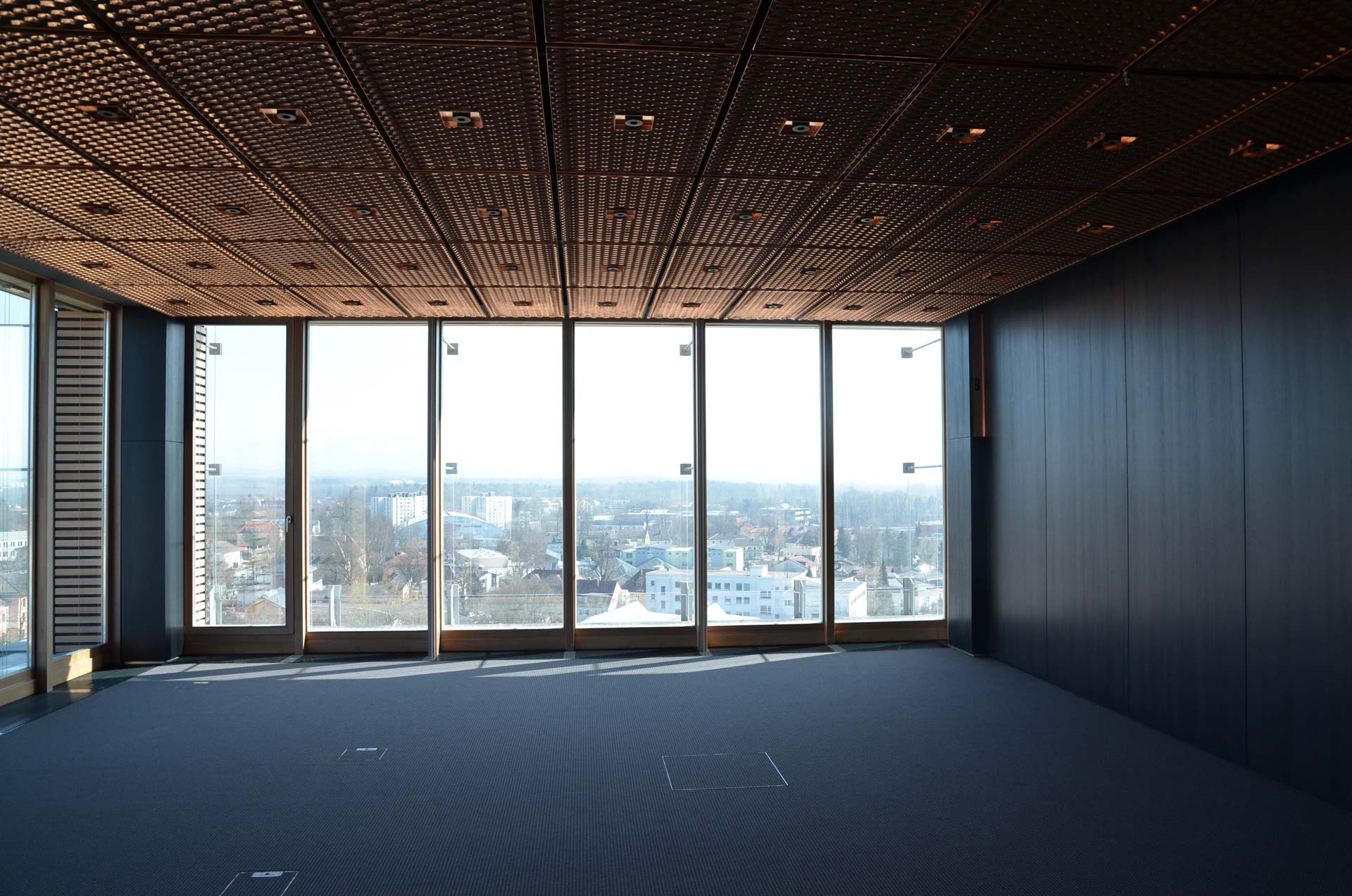In order to implement operable windows and shading systems on all levels of the building, wind protection was required. Wind, sun, and temperature dependent motorized dampers control the ventilation of the double facade cavity, creating a climate buffer and reducing the wind pressure. This allows natural ventilation of the office spaces. The cavity accommodates highly reflective blinds in front of the internal windows and keeps the wooden structure from weathering. The massive concrete parapets were removed, exposing the fairly thin reinforced concrete slabs. In the summer, good thermal comfort in the office space was realized with regenerative radiant cooling using capillary mats on the underside of the ceiling in conjunction with the direct use of groundwater wells.
