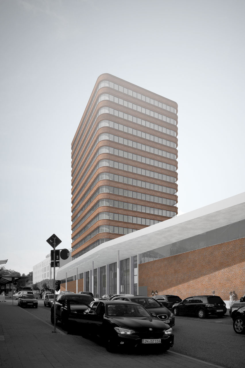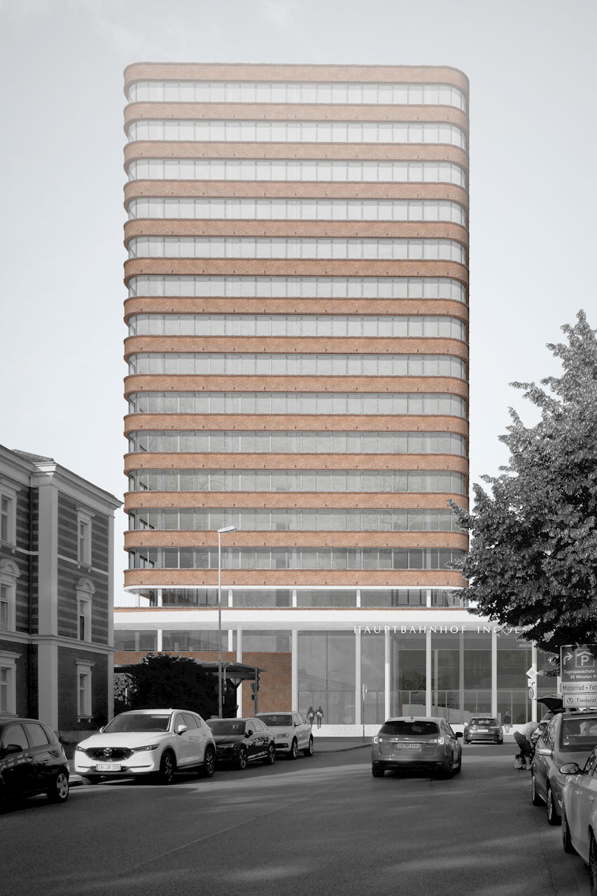 The existing main train station will be replaced by a new building, which will be a striking 60m/200 feet structure. The base area will accommodate the 2-story station concourse, plus retail shops on the ground floor and administrative rooms for Deutsche Bahn on the first floor. Separated from this, a narrow high-rise cube with planned office and hotel space is being built above it. One floor in between is to serve as a plaza with a roof garden. An external staircase on the level of the station concourse and platforms will offer access to the station.