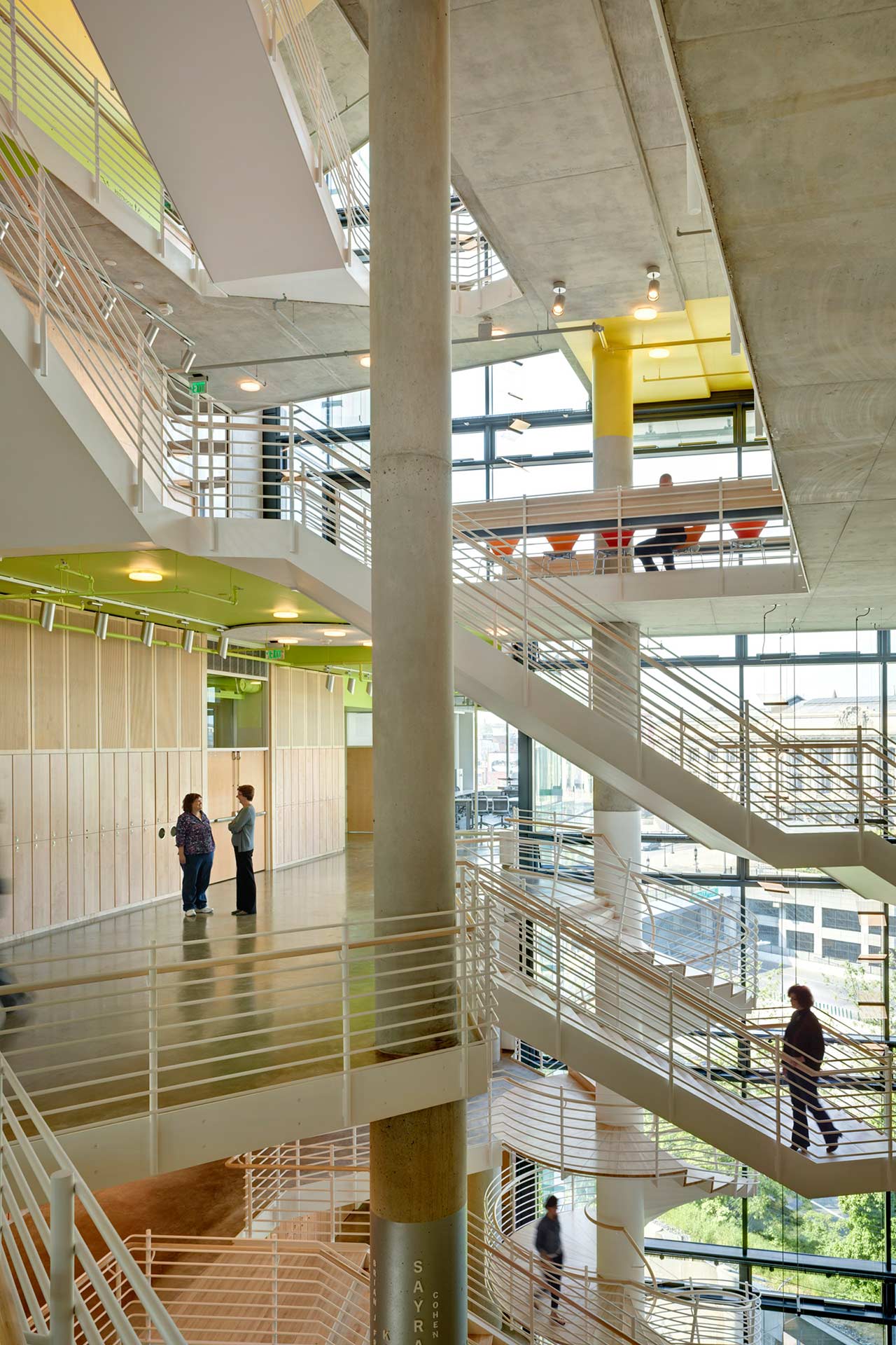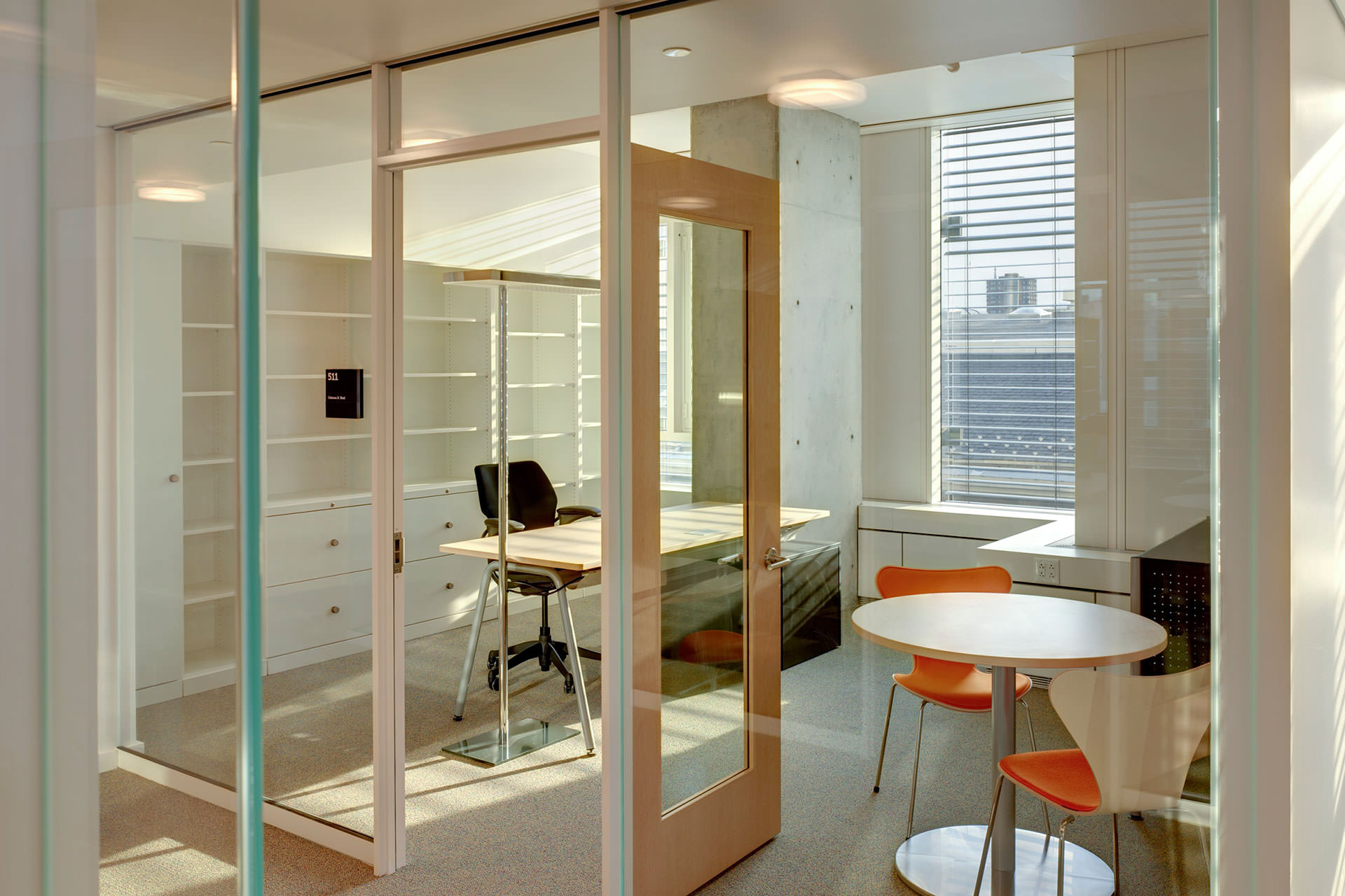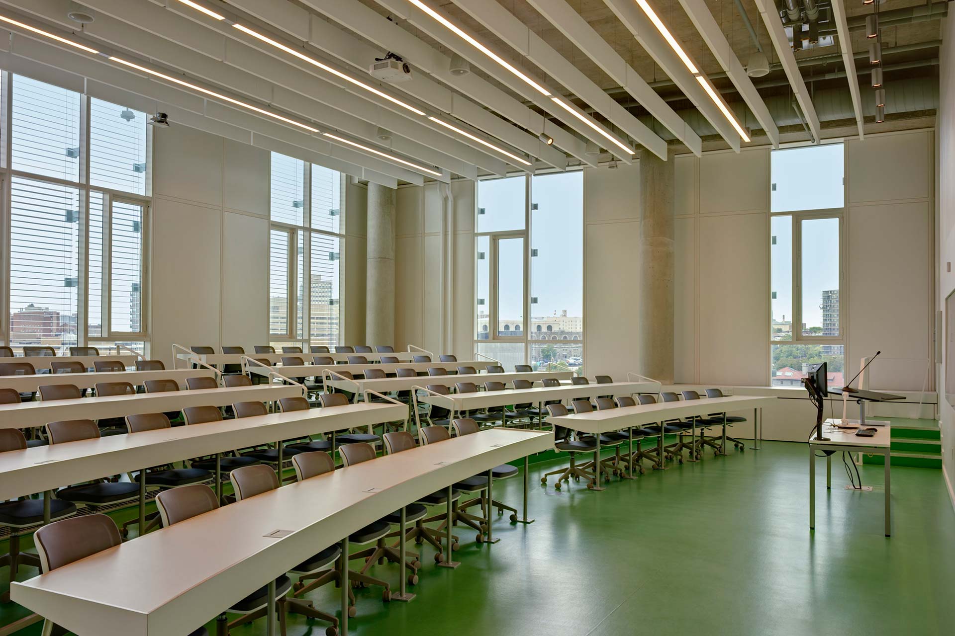 The building unites classrooms, faculty offices, administrative space, and the law library under a single roof. A difficult urban situation required a smart composition of the program areas in order to provide daylight throughout the building and to allow for cross ventilation. The integrated climate concept responds to both varying programmatic requirements and Baltimore’s humid summer climate, moderate winter, and moderate intermediate seasons.