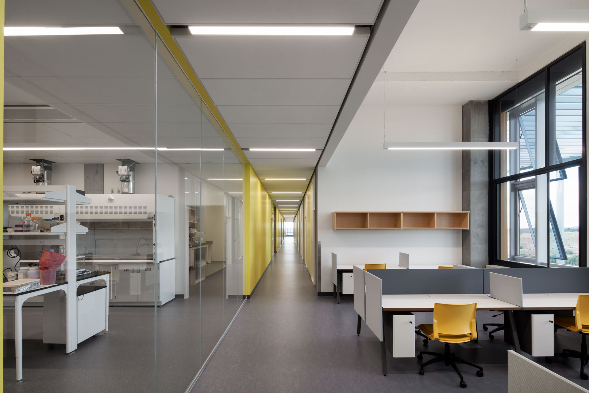 The plenum with its air volume is also an element of the laboratories' air supply: their room exhaust air is discharged via an enthalpy wheel, which is particularly energy-efficient: it transfers heat to the cold outside air while entering and humidifying it at the same time, after which it refreshes the air volume of the plenum from which the offices and laboratories are supplied.
