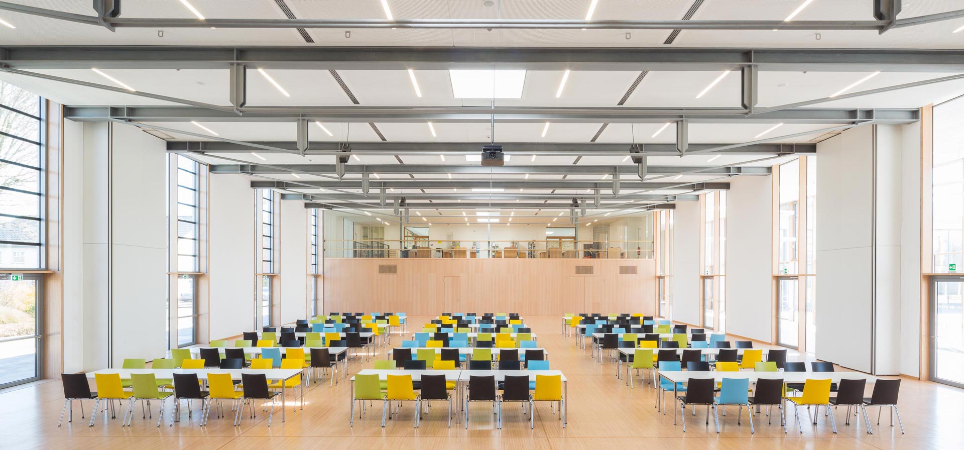 The lighting concept is energy-conscious as well: Intensive studies on daylight values in advance characterized the planning. With presence detectors and daylight-dependent controls as well as large windows with low parapets, supplemented by skylights and LEDs for sufficient lighting, the solution for building operation is optimal. Cost-effective lightweight panels made of excelsior are used as ceiling sails in the classrooms to ensure good acoustics. They require less space than, for example, gypsum plasterboard and thus allow more thermal storage mass to remain due to non-suspended ceiling areas.