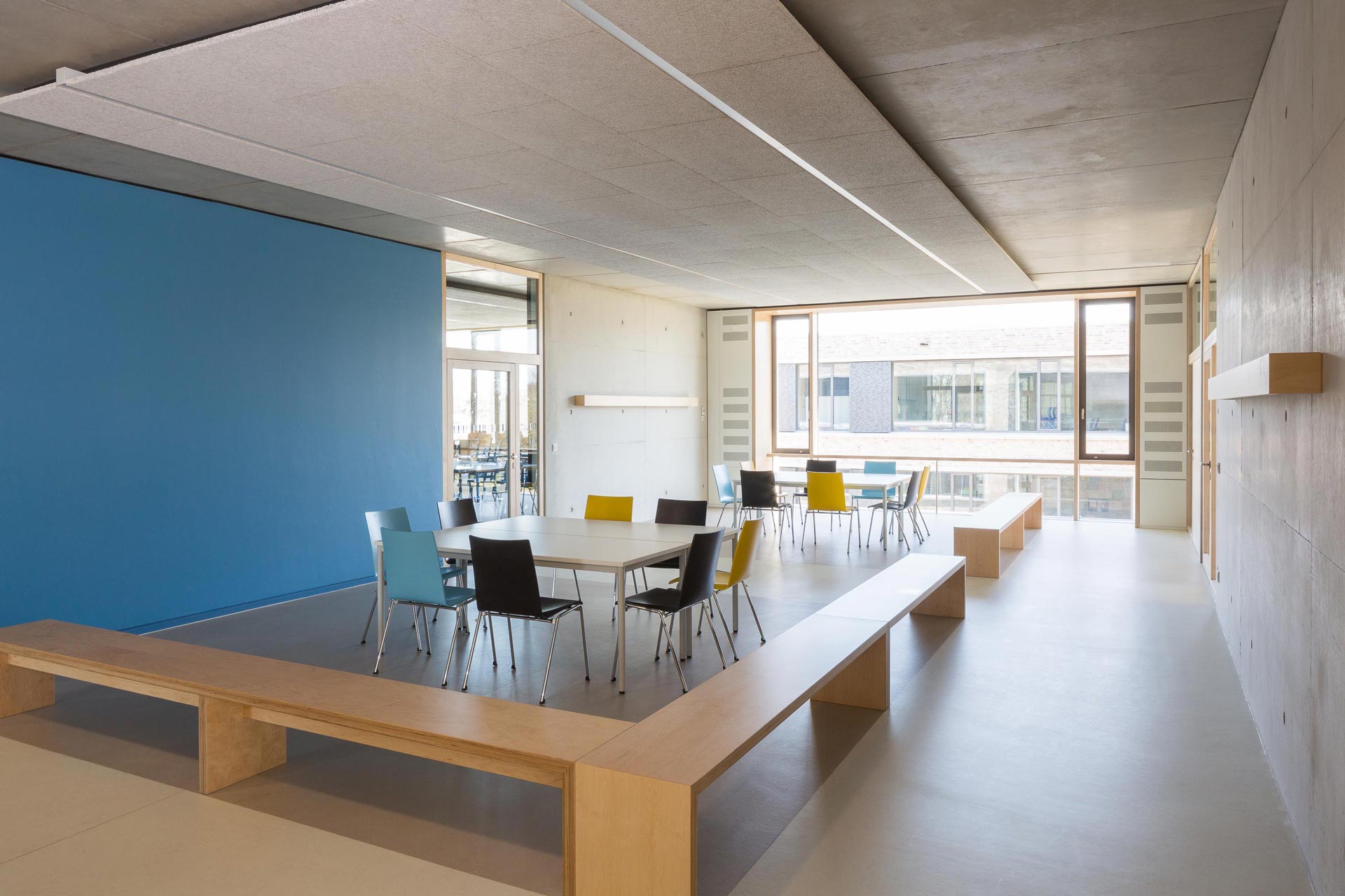 Transsolar was in charge of fulfilling the request for exceptional energy efficiency and developed the energy concept with barely visible solutions for a well-thought-out interaction of building, technology and user requirements. Exposed concrete in the interior has room-climatic aspects: the concrete surfaces in the classrooms serve passively as thermal storage and cool the classrooms during summer. Roof and walls have large insulation thicknesses and thus a high energy standard.