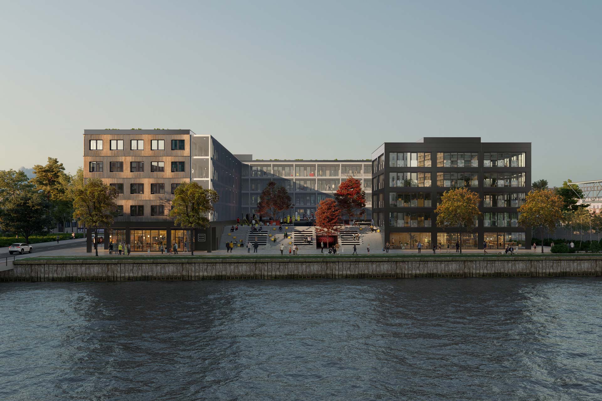 The harbor at the Main River in Offenbach, offering views of the Frankfurt skyline, is developing into a creative quarter. The "RockyWood" project construction site is between the listed Heynefabrik and a future new building for the Hochschule für Gestaltung (School of Design). It is an ensemble of two buildings, "Rocky" and "Wood".