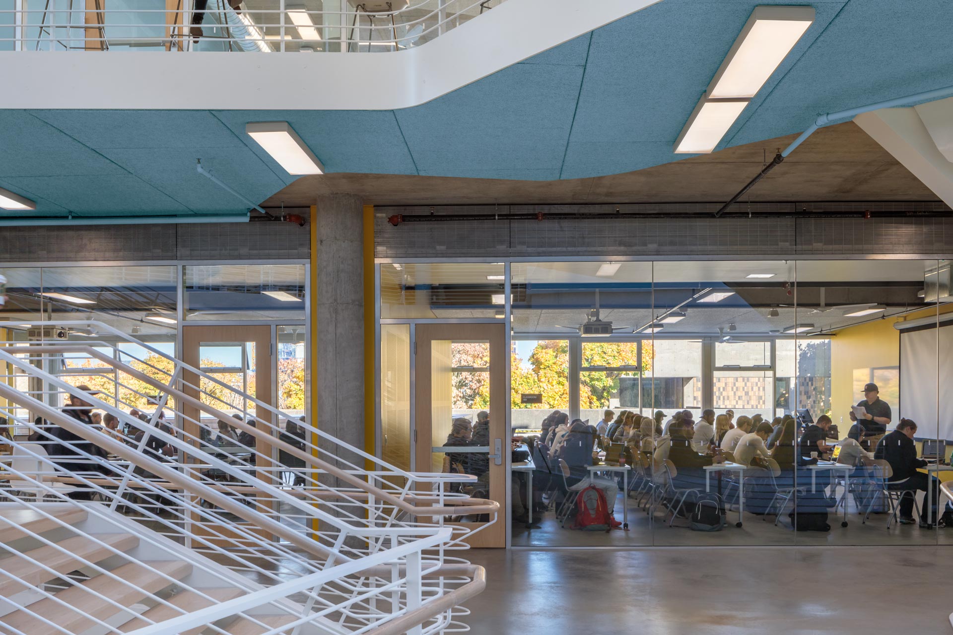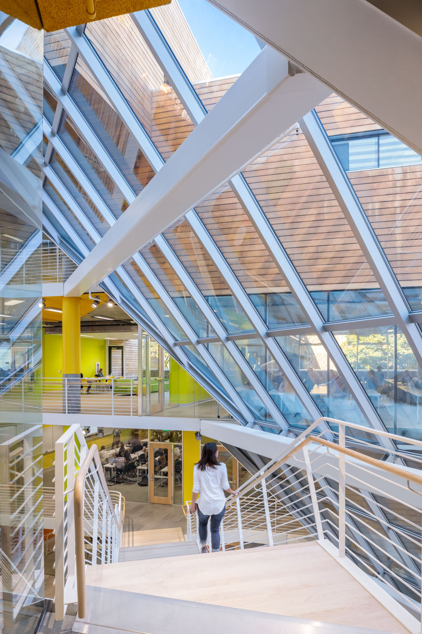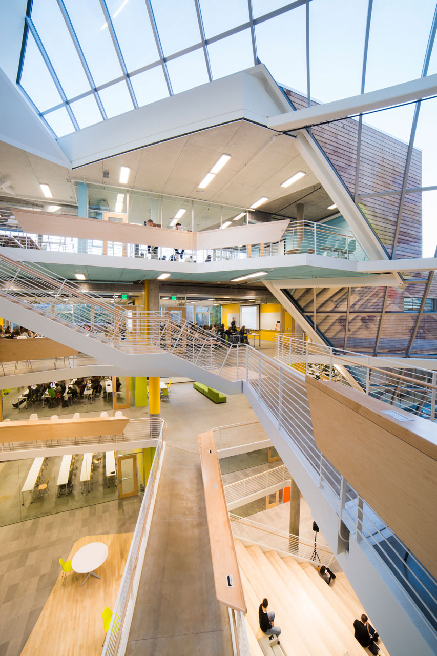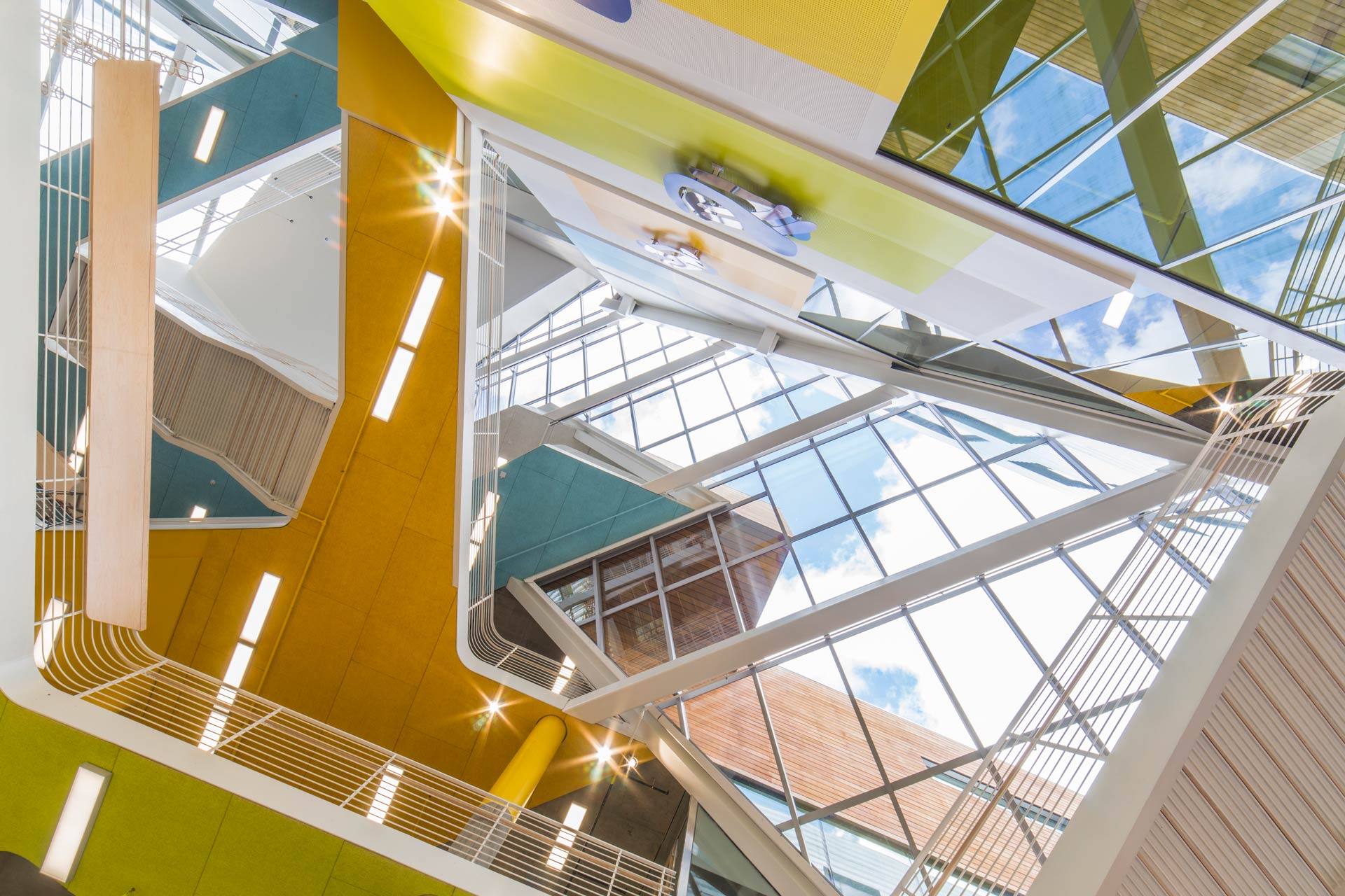 The atrium social/circulation space brings daylight to the center of the building and drives natural ventilation, while areas of green roof create a natural vibrant environment for the students.