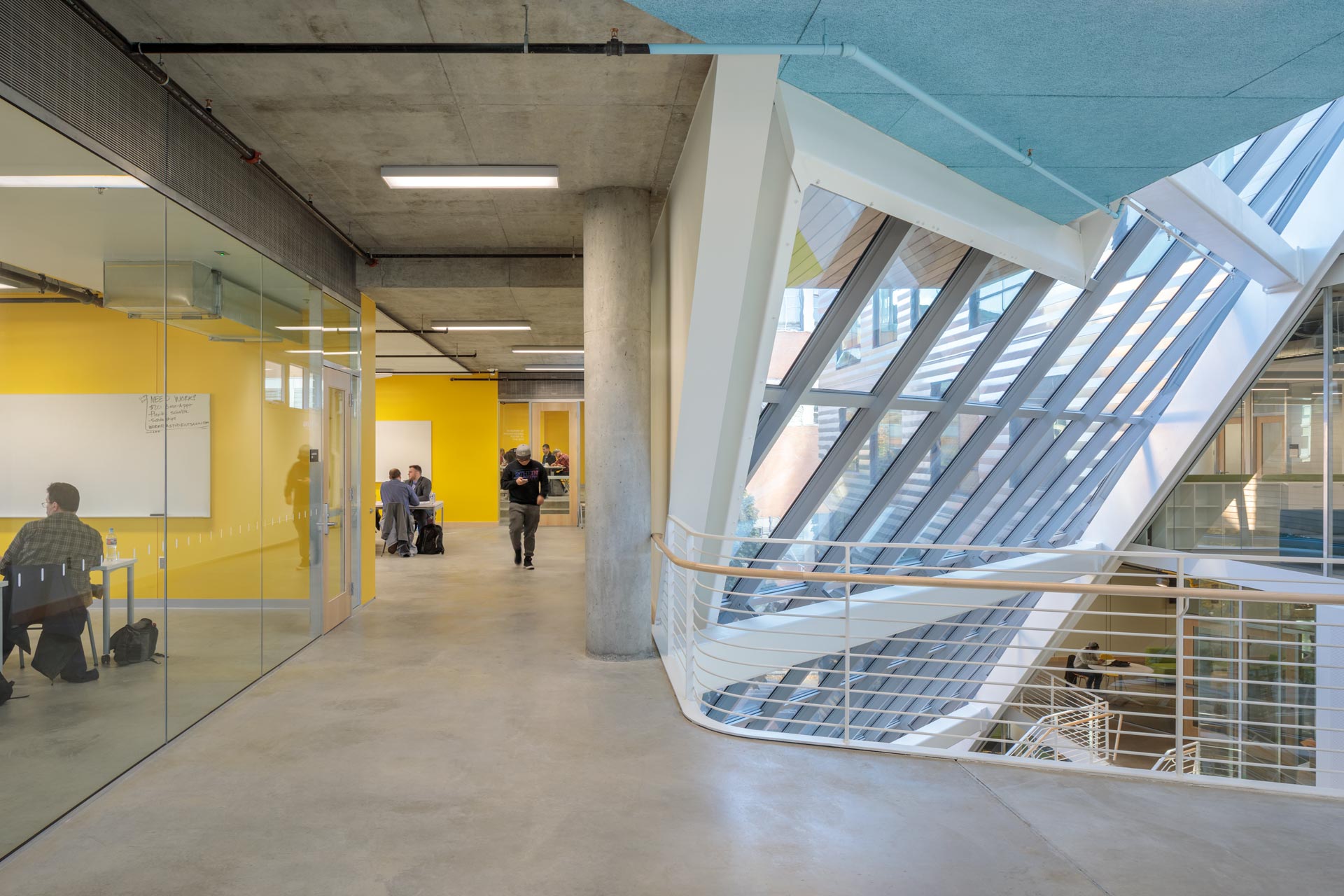 The project has a variety of innovative climate concepts including natural ventilation in all perimeter spaces throughout the building, and no installed mechanical cooling in the Karl Miller Center. This is achieved through a scientific approach to setting acceptable upper thermal comfort limit – 83 °F for naturally ventilated spaces with ceiling fans, as well as night flushing, thermal mass and occupant controlled automated operable windows.