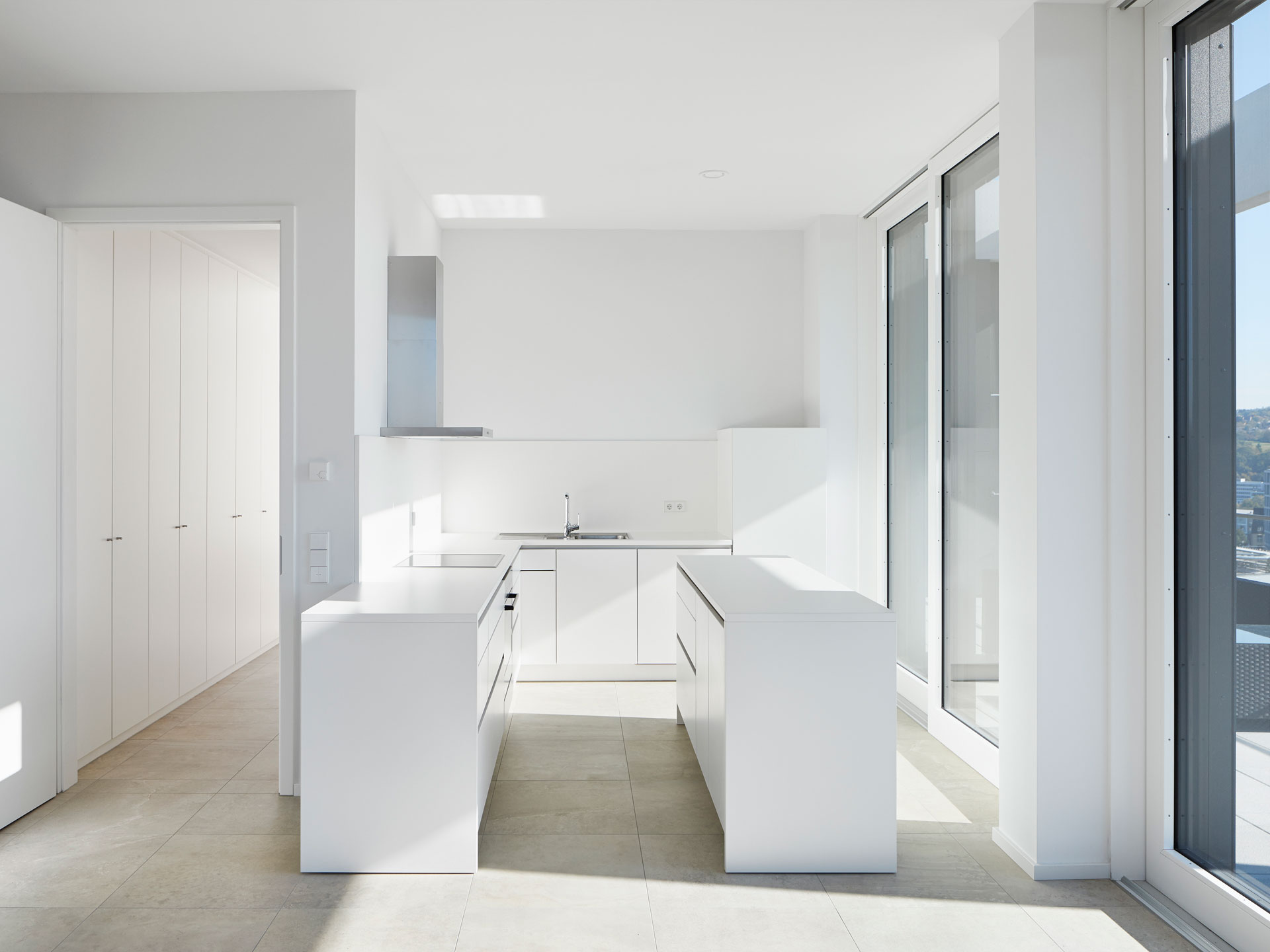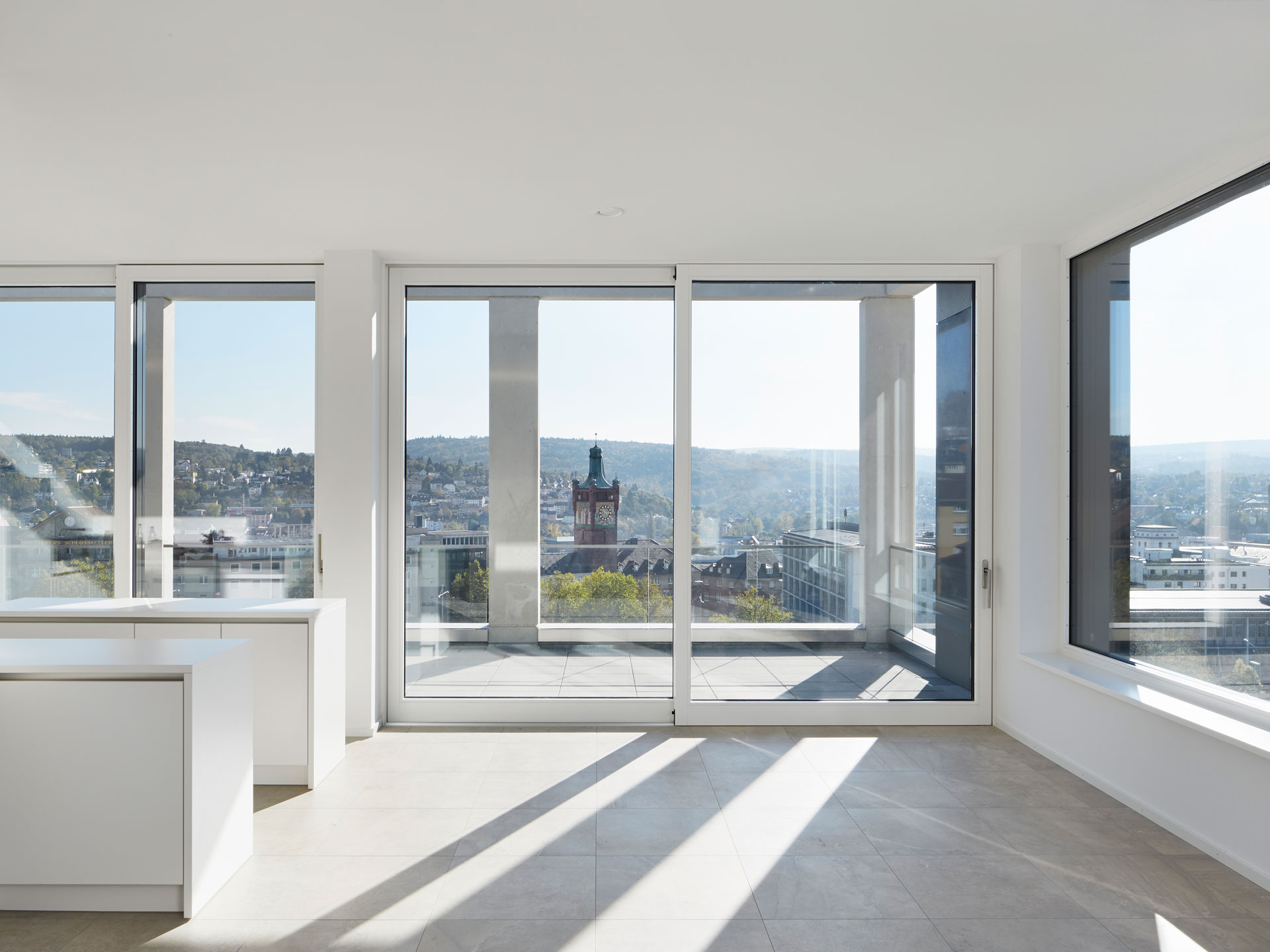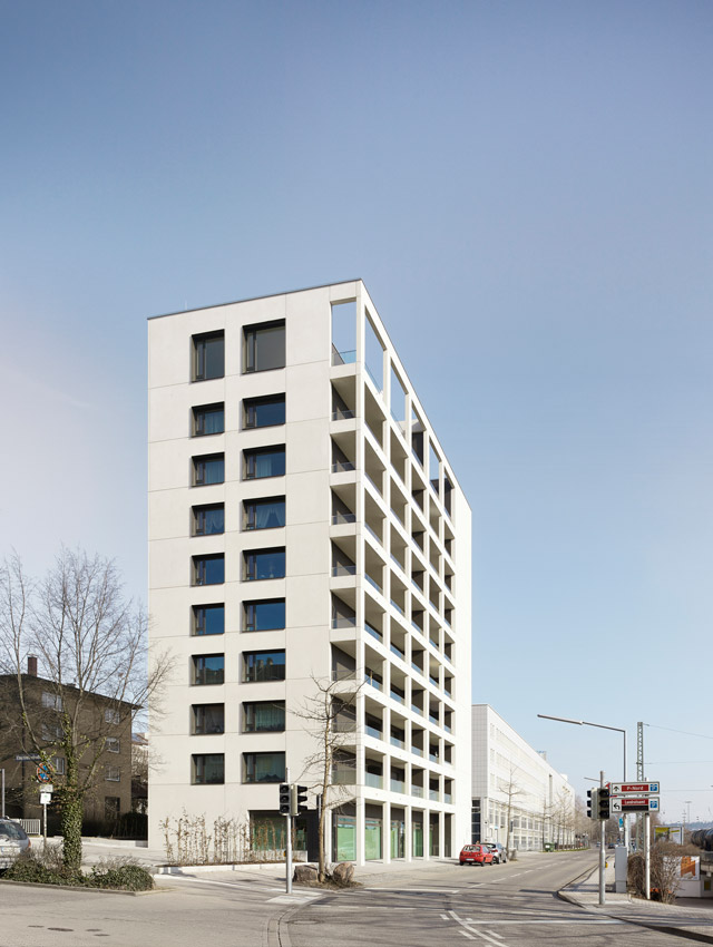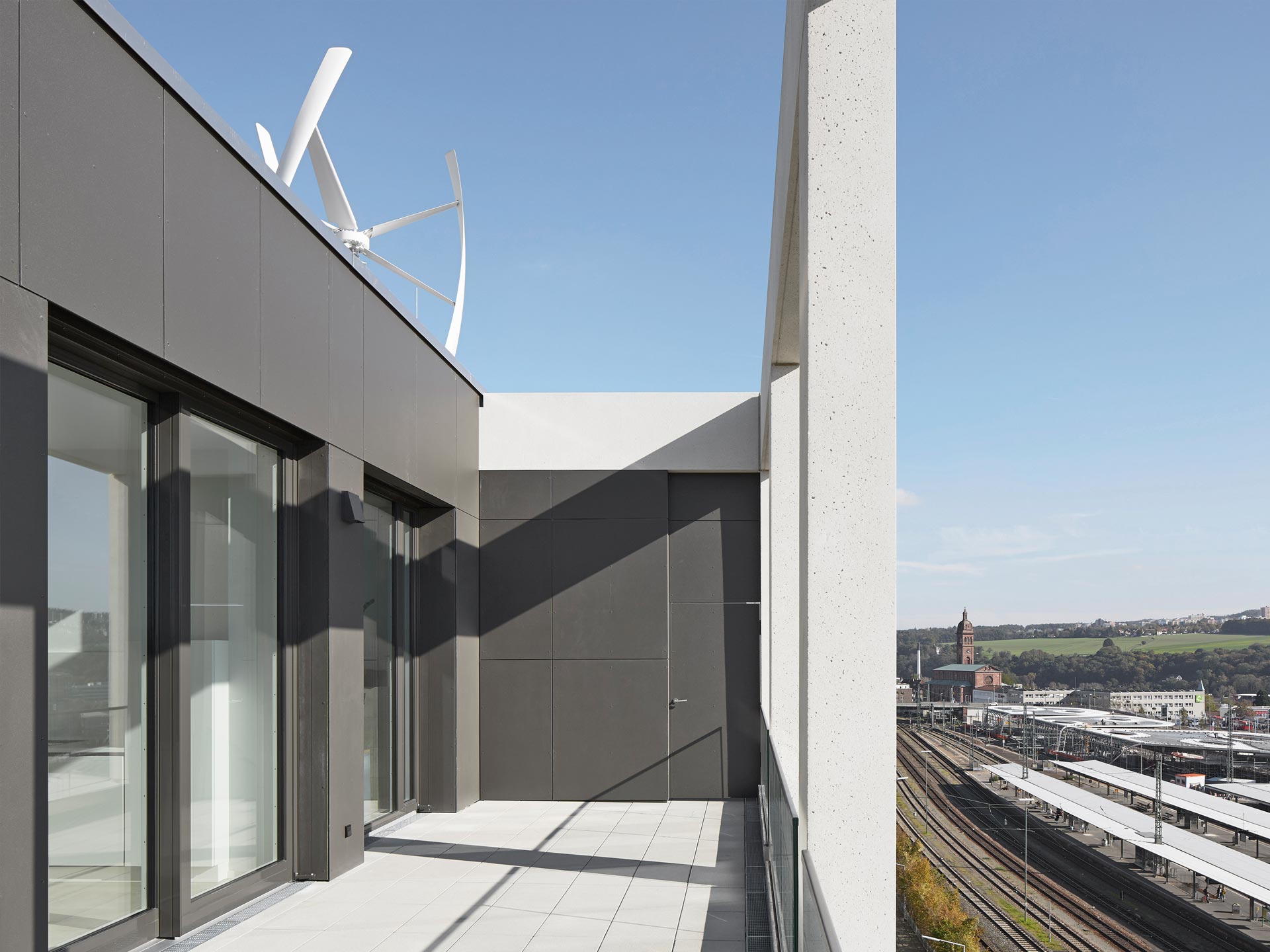 The nine-story residential high-rise from the 1970s was in need for refurbishment and is now a modern almost-zero-carbon-emission building. Located next to the main train station the building acts as a “light-house” in terms of sustainability and urban design quality. It was one of fifteen buildings funded by the German dena initiative "zukunft haus" (future house) with the aim "towards the Efficiency House Plus - carbon neutral construction and renovation". Only housing projects that go beyond the usual standards and use innovative solutions are considered for the funding.