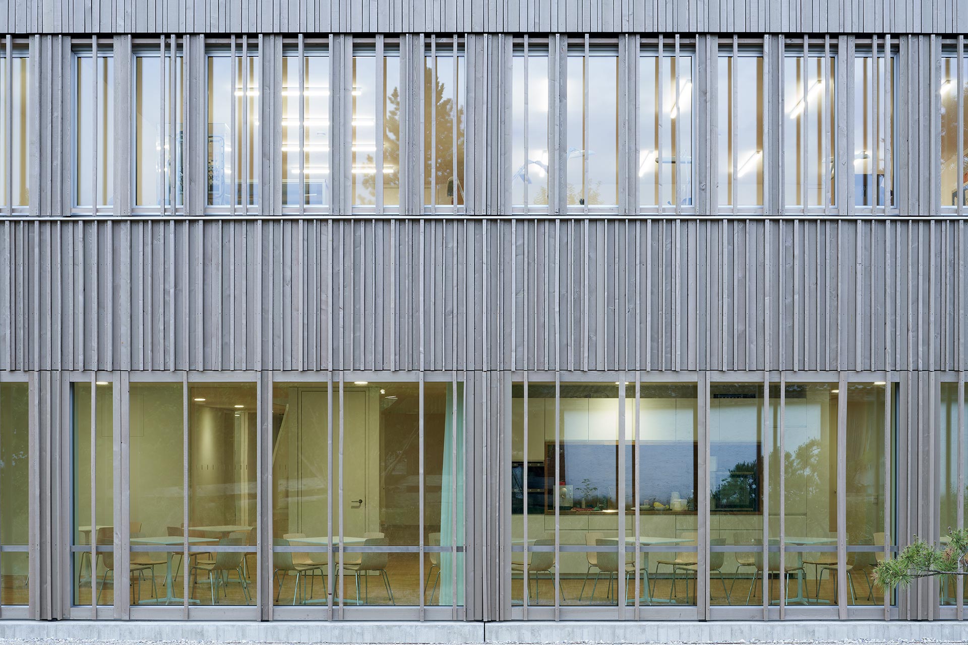 An external, static sun protection system offers summer thermal protection based on robust “Low-Tec”: the first and second floors feature vertical wooden slats which characterize the appearance of the façade.