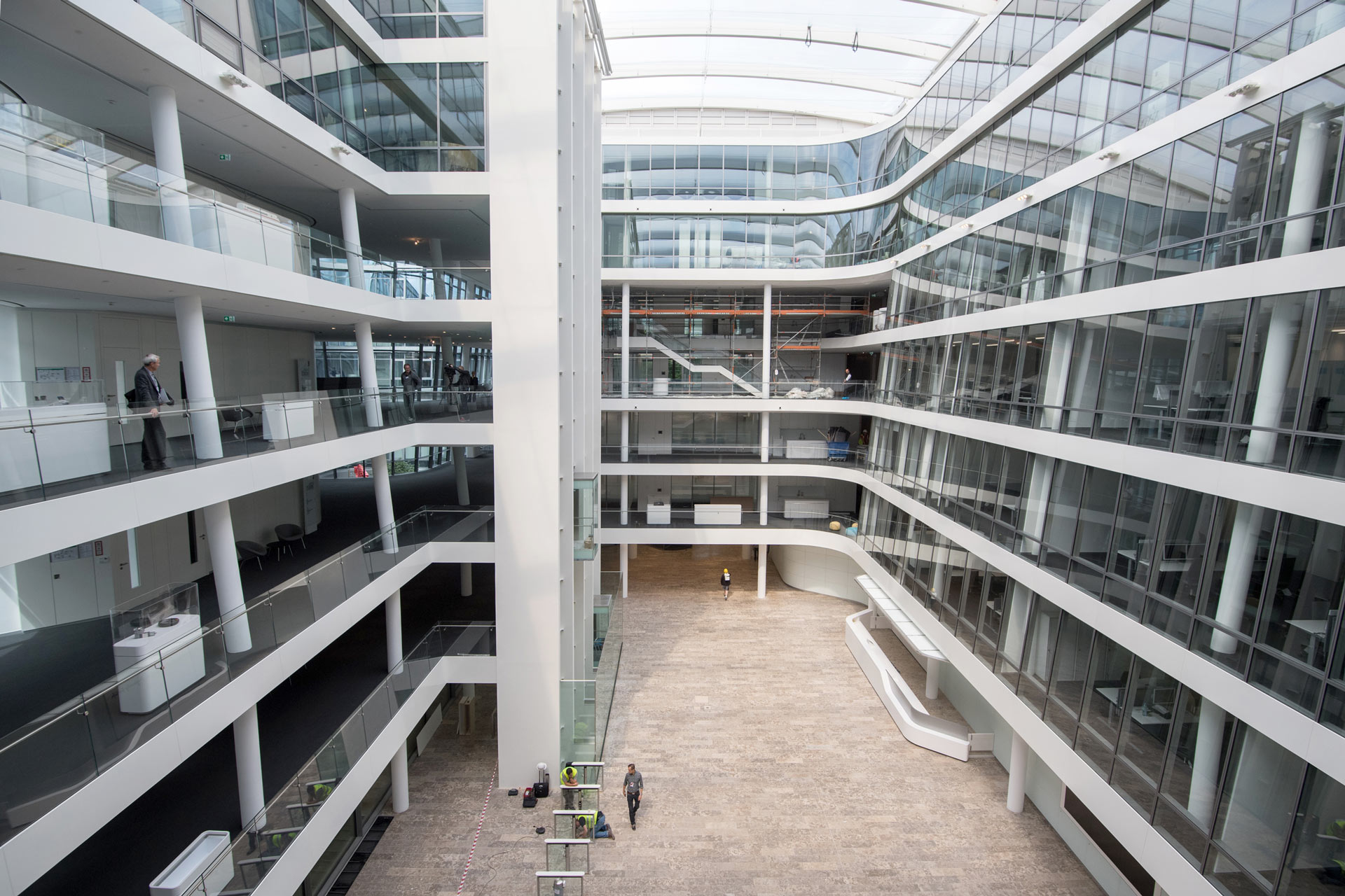 The heating system is based on district heat by the municipal utilities of the city of Munich - generated by cogeneration and geothermal heat pumps, which is favorable in terms of primary energy. The cooling is done free through cooling towers or indirectly through groundwater via a thermally activated floor plate that stores cooling load peaks in summer and serves as a low-temperature source for heat pumps in winter.