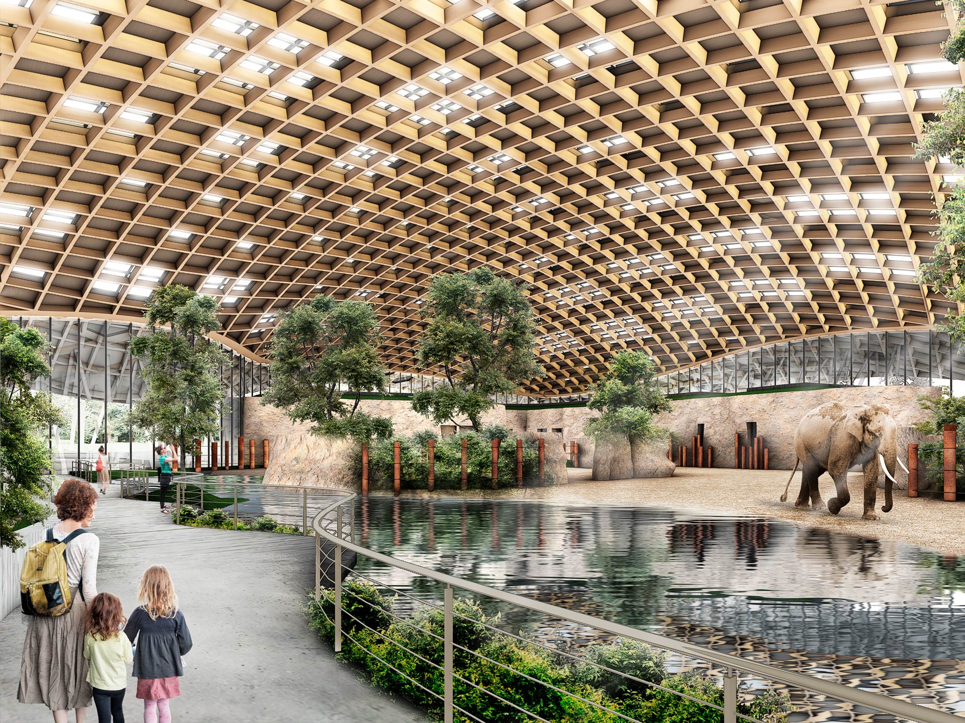 The botanical garden and Zoo "Wilhelma" in Stuttgart is realigning and modernizing itself at the same time. The crowning project for the emerging Asian complex is „Elefantenwelt“, (Elephant World), a new building with a large outdoor area. The existing building is already more than 40 years old and will be replaced by a modern building that allows for contemporary keeping: a wooden shell construction with a span of 100m / 330 feet, with large outdoor facilities offering enough space for a herd of Indian elephants.
