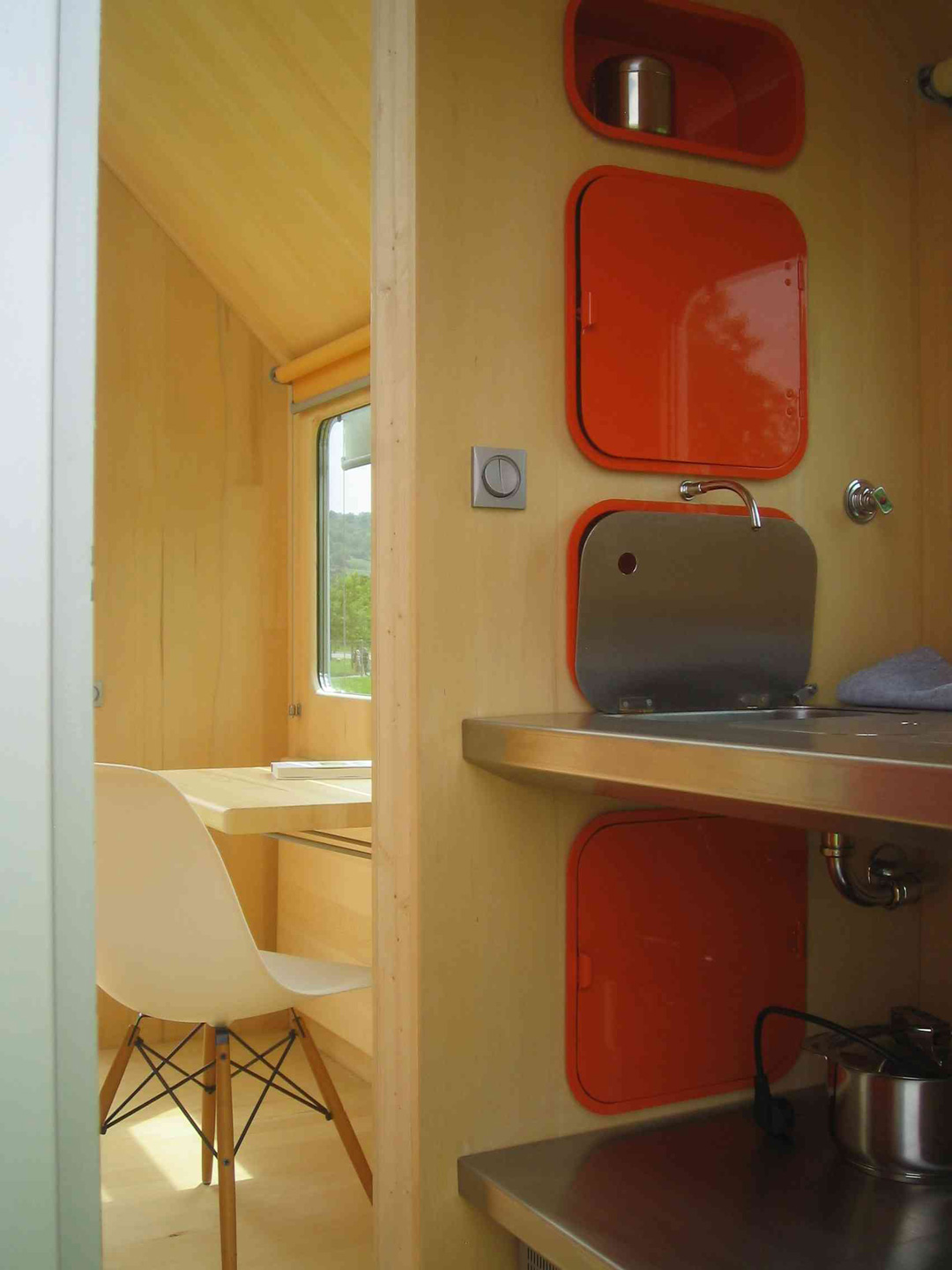 “Diogene” is equipped with everything you need for living. The front part serves as a living room: On one side, there is a pull-out sofa; on the other, a folding table under the window. Behind a partition, there are a shower and toilet as well as a kitchen, which has also been reduced to the necessary. The house and furnishings form a single unit. It is constructed from wood with a warm character, which also defines the interior. For the purpose of weather protection, the exterior is coated with aluminium paneling.
