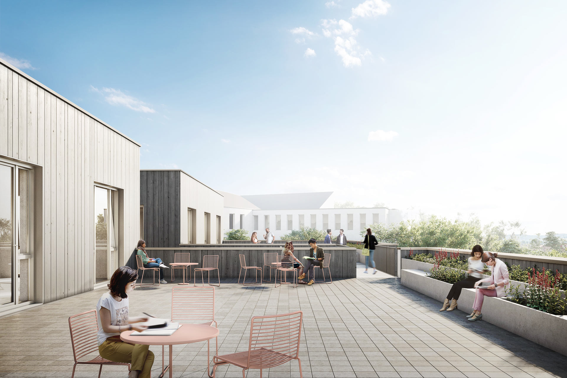 Nine seminar rooms will be created, some of which can be flexibly interconnected for 25-200 people; a multi-story library, café with lounge area, and a room of silence. A large, flexibly usable event room will offer space for up to 355 people. More than 50 offices are planned to be used in various ways. For student learning groups, 26 learning rooms will be created, plus about 100 open learning spaces in communication zones. The outside area will also be redesigned, and a café, learning meadows and recreational facilities will be created.