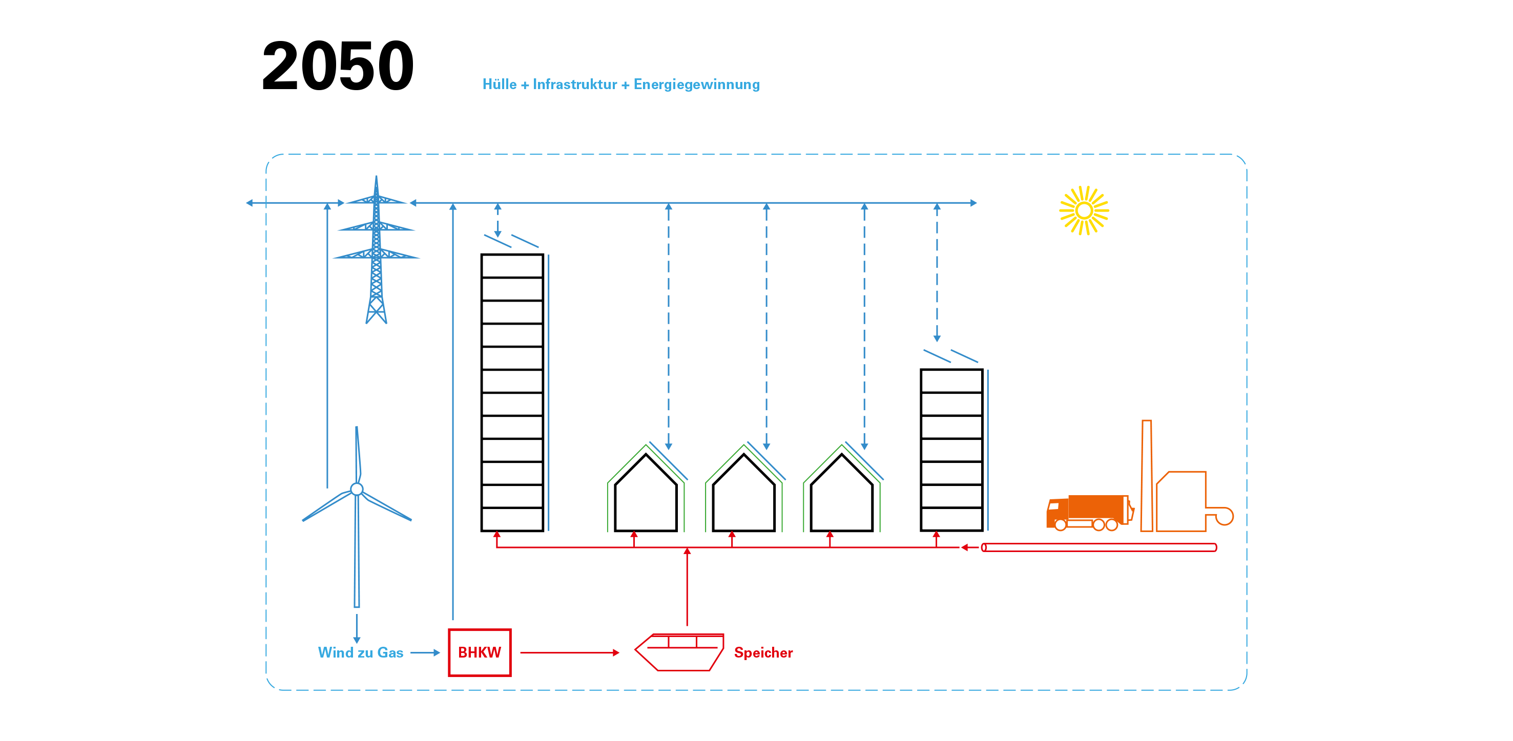 It therefore seems sensible not to misuse energy networks arbitrarily as „ideal energy stores“ in balancing, but to maximize the local energy self-sufficiency of a property. Clearly, this is easily possible in the countryside with relatively flat buildings but is extremely ambitious in existing cities with multi-story buildings and mutual shading. Therefore, it seems sensible to minimize the energy requirement in each individual case and to make the best possible use of the local potential of regenerative energy generation in order to be able to become neutral in the aggregate.