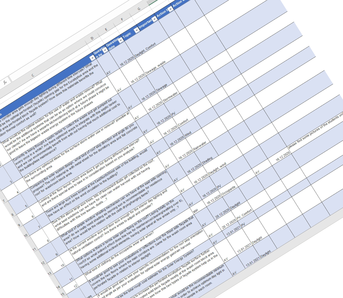 Was bei den Treffen nicht zur Sprache kommt, aber wesentlicher Bestandteil des Projekts ist, ist die interne Organisation. Wer sich welchen Themenbereich vornimmt, haben die Fellows zwar schon geklärt. Das ist aber bei Weitem nicht alles. Es darf ja nichts verloren gehen. So muss man Fragen, Themen, Gedanken, Ideen, etc. nicht nur aufschreiben, sondern auch sortieren und die resultierenden Aufgaben zuordnen. „Pilotin“ Michelle Hur legt eine Tabelle an, zeigt wie es geht. Dies künftig übernehmen muss aber jemand der Fellows, oder sie wechseln sich ab.