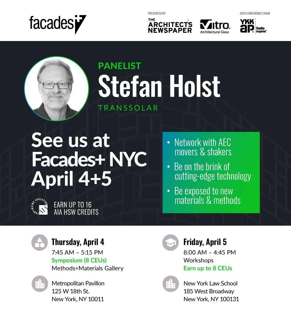 Stefan Holst spricht auf der Veranstaltung Facades+ NYC am 4. April über "Aiming for No Impact", also die Zielsetzung ohne (negativen) Einfluss auf die Umwelt zu bauen.
