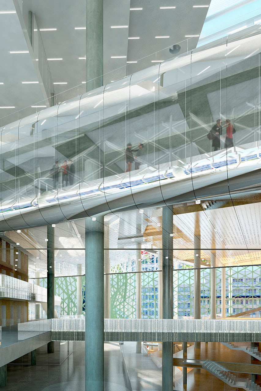Das anspruchsvolle Raumgefüge des Entwurfes stellte besondere Anforderungen an die Konzeptplanung für die innere Funktion des Gebäudes als moderner Arbeitsplatz. Die hohe räumliche und visuelle Qualität des zentralen Atriums als Tageslichtquelle für das Gebäude als Ganzes auszuspielen war dabei ein Hauptaugenmerk. Für den lichtdurchfluteten Raum hinter einer hochtransparenten Fassade wurden alle relevanten Kriterien und deren Auswirkung auf den visuellen und thermischen Komfort detailliert ausgewertet. Zum Einsatz kamen dabei neben der dynamischen thermischen Gebäudesimulation auch eingehende Strömungsanalysen (CFD) sowie die dynamische Simulation des Tageslichts. Ferner wurde auch die zu erwartende CO2-Konzentration in den Arbeitsbereichen simuliert um das Lüftungskonzept zu validieren und somit eine gute Raumluftqualität sicherzustellen. Für die Arbeitsbereiche wurde ein dezentrales Konzept auf Basis lokaler Blendschutzmaßnahmen entwickelt. Die genaue Abstimmung der Fassadenqualität sowie Analyse der Eigen- und Umgebungsverschattung zeigten, wie die Anforderungen an thermischen Komfort und Energiebedarf im Atrium eingehalten werden können.