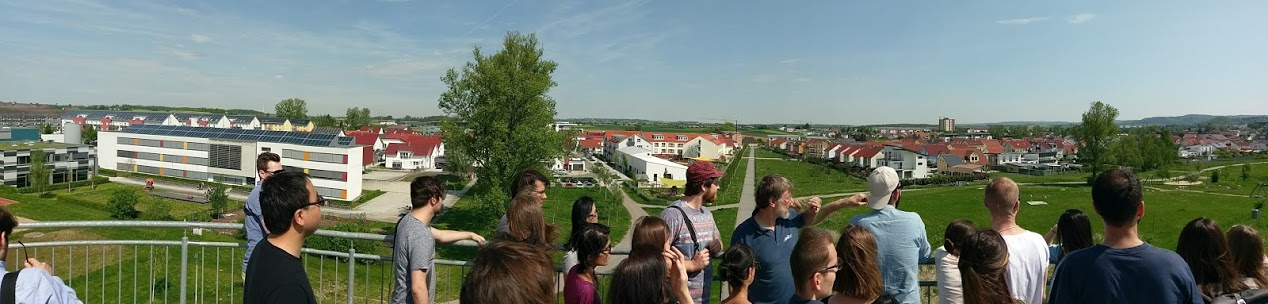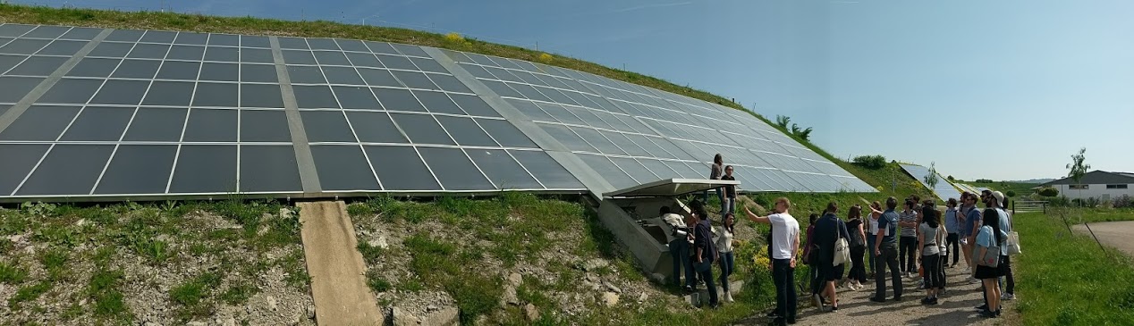 We visited first the community solar thermal system in Crailsheim. Solar thermal energy is collected from the residential rooftops and nearby grassy hillsides. The energy is stored seasonally underground and provides 50% of the heating needs for the 2000 residents. The homes are also connected to a district heating system. We saw the two thermal buffer tanks, the technical room containing the heat pump, and the geothermal field.