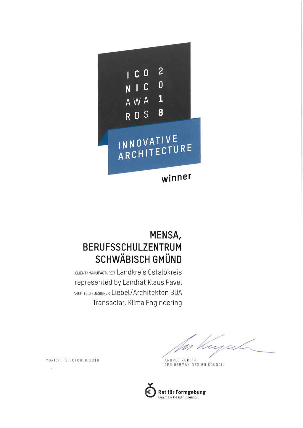 The cafeteria of the District's Centre of Vocational Schools in Schwaebisch Gmuend was awarded with the Iconic Award for Innovative Architecture. The new cafeteria sets an example for a sustainable, efficient and economic construction. We are very proud to have been part of the team of Liebel Architekten.