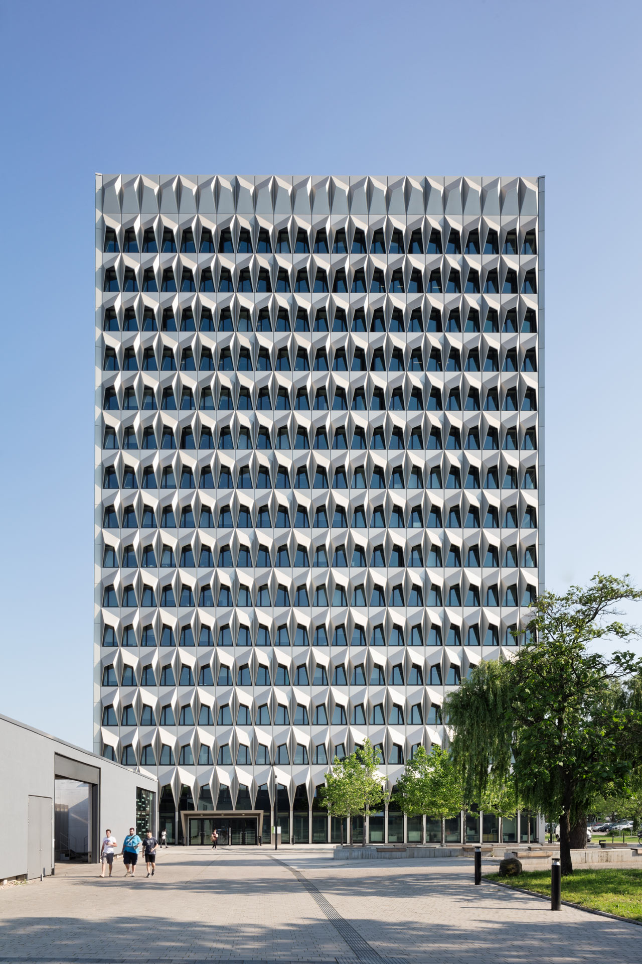 Les architectes Staab ont remporté ce concours grâce à une conception de façade munie de protections solaires fixes externes (brise soleil). L’avantage de ce système pour une tour, est que, même avec des vitesses de vent élevées, la protection solaire ne peut pas être endommagée. L’inconvénient est qu’il diminue l’apport en lumière naturelle lors des périodes nuageuses. Il a donc fallu trouver un équilibre entre un apport en énergie, les jours de soleil et une lumière naturelle suffisante les jours nuageux. Pour cela, 40 variantes ont été modélisées, simulées et analysées. Ceci n’aurait pu se faire sans une très étroite collaboration avec les architectes. La répartition des éléments photovoltaïques sur le brise-soleil a été étudiée et ne sera pas réalisée pour des raisons budgétaires.