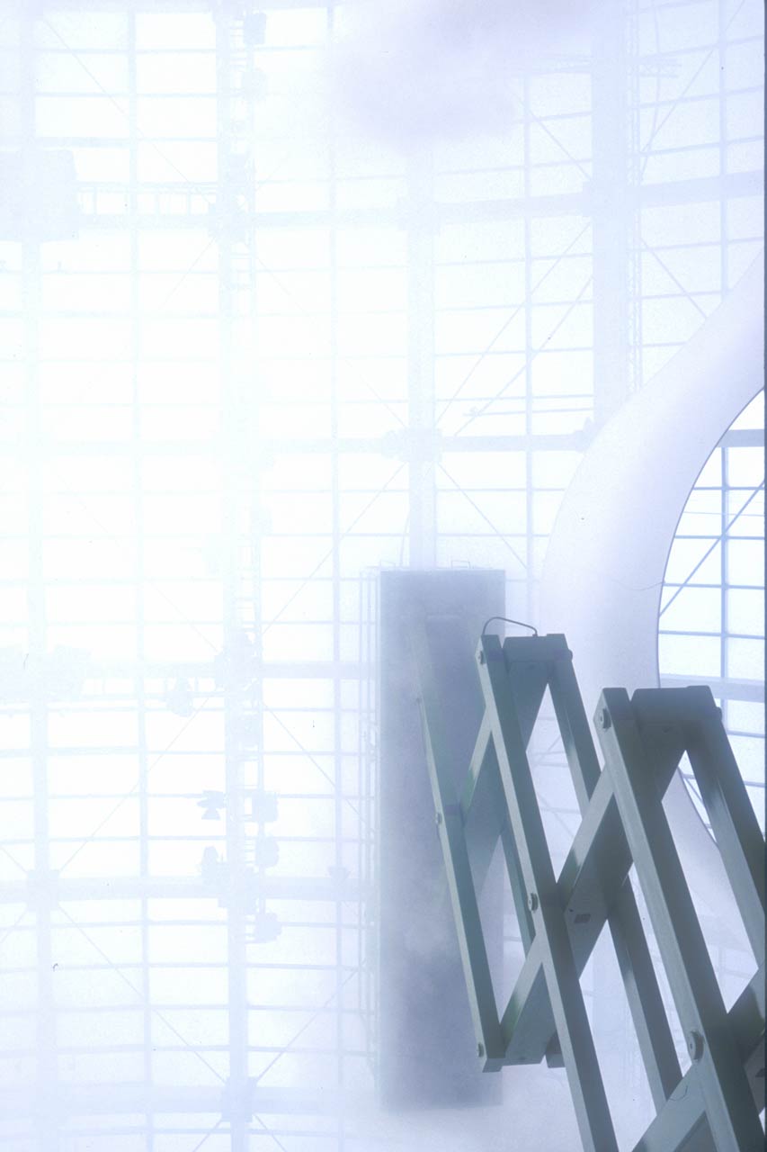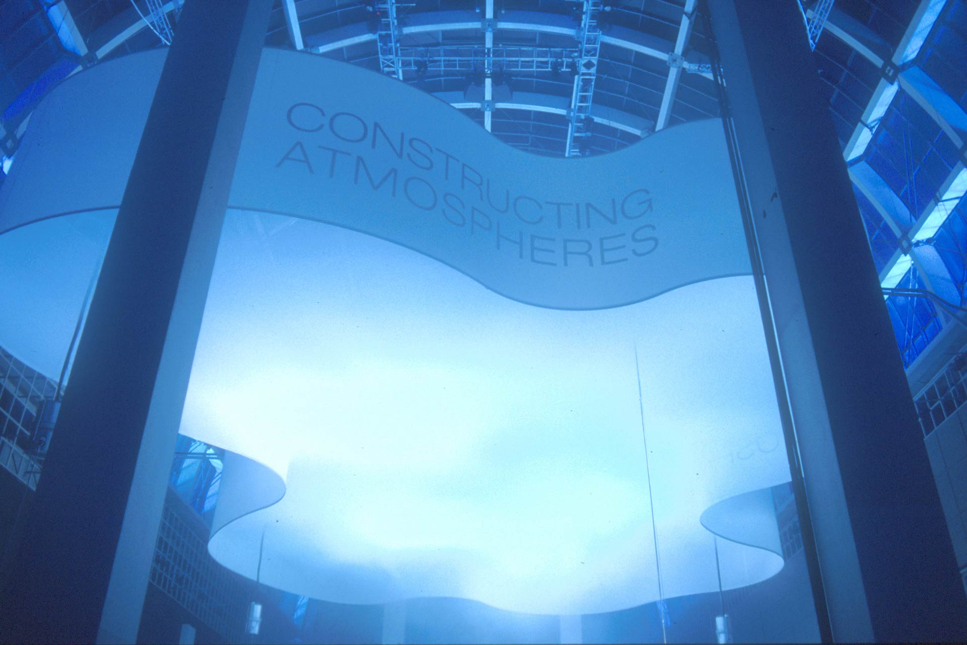 The objective was to create a stable indoor cloud as part of the show “Constructing Atmospheres” at the exhibition Light & Building / Aircontec 2002. Twice a day a several-hundred-cubic-meter-large cloud was generated from air layers of varying humidity and temperature inside the Galleria Frankfurt in a single-glazed linear atrium connecting wings of various exhibition spaces. By creating a stable temperature stratification within this large air volume, the induced saturated water vapor stayed within the given boundaries. At nightfall the Experimental Cloud has been transformed into an illuminated body hanging over the Cloud Club.