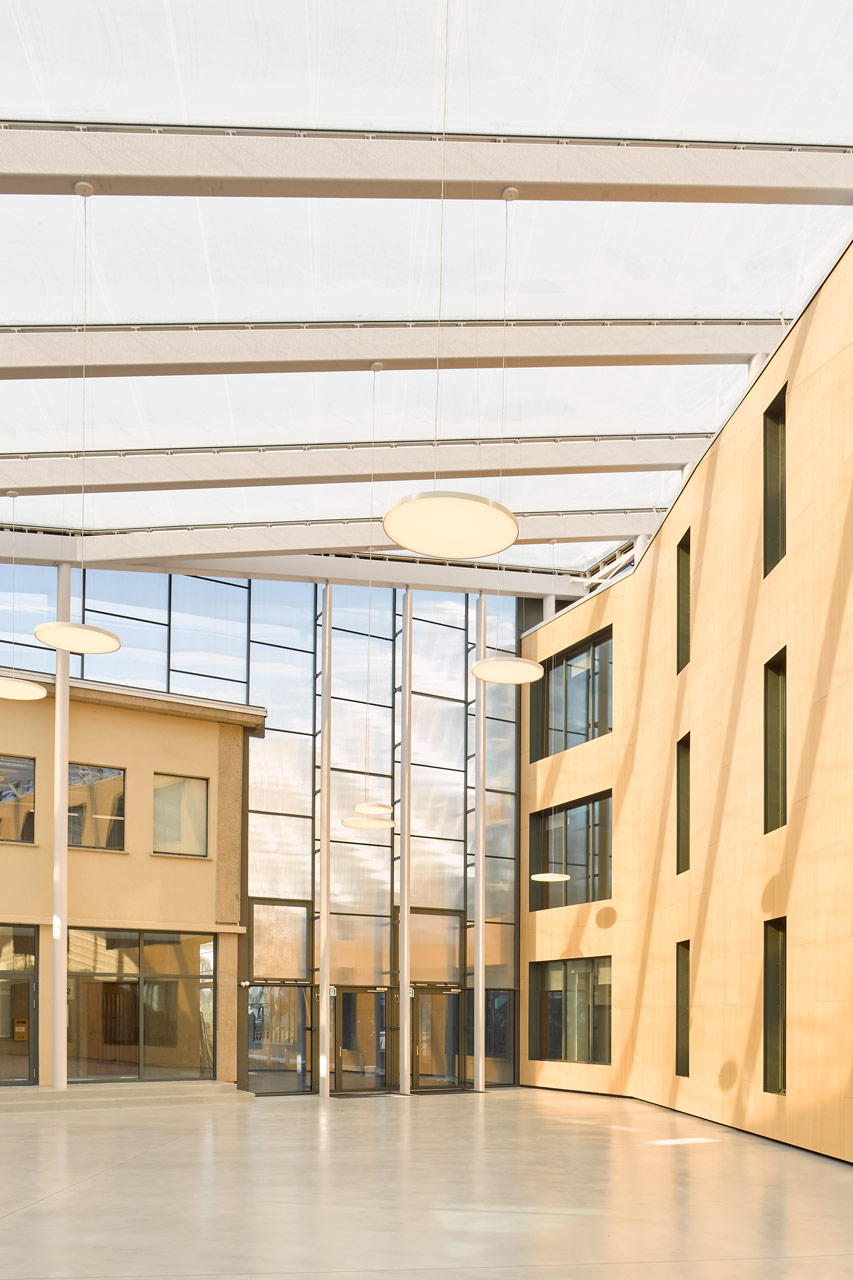 Glazing and internal glare protection complete the protection against too much sun and heat. Natural ventilation (hybrid ventilation) of all non-laboratory rooms serves as both the supply of fresh air and night air flushing of the rooms. In all non-laboratory rooms, solid ceilings are exposed so that they can absorb thermal loads.