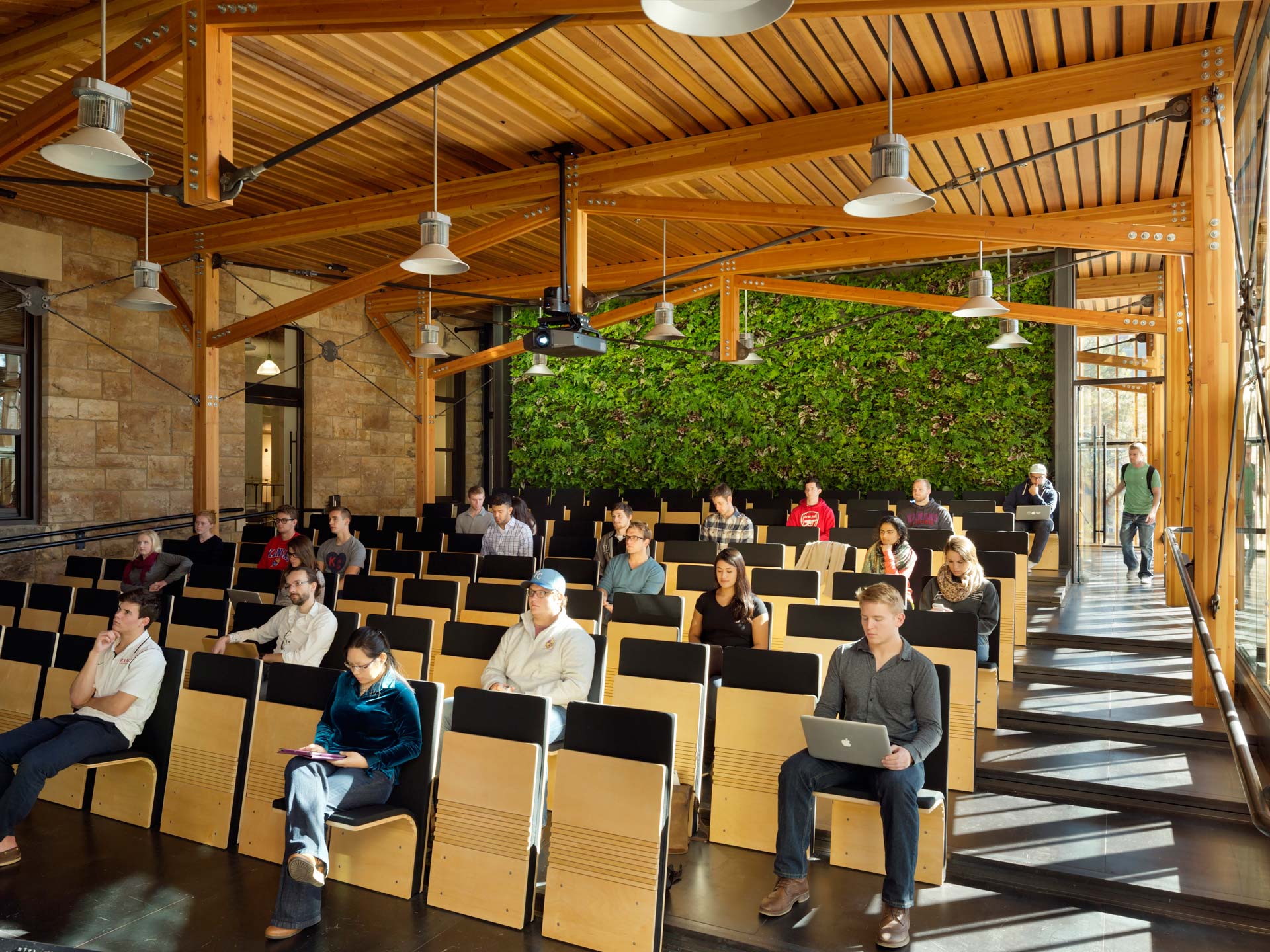 Le forum est un ajout au hall Marvin situé dans le bâtiment historique de l’école d’architecture de l’université du Kansas. Il satisfait les besoins critiques de l'école pour un espace central commun et un auditorium, qui n’étaient initialement pas présents dans le Marvin Hall. Il a été conçu et construit uniquement par les étudiants en architecture de troisième cycle et les participants de Studio 804, le département d'architecture du programme de conception/construction et avec le soutien de divers experts du secteur. Transsolar a servi de conseil quant à la conception et à l’intégration dans les concepts architecturaux des systèmes climatiques de la double façade et de la ventilation naturelle. La double façade est faite de deux murs séparables fait de verre isolant, distant de 1 mètre l’un de l’autre. L’espace intermédiaire permet l’insertion de persienne en cèdre. Des clapets motorisés sont situés en haut et en bas de la couche externe. Lors des jours doux, la ventilation mécanique s’arrête, les clapets s’ouvrent, et la ventilation naturelle transversale est utilisée pour apporter de l'air frais dans le volume directement depuis l’extérieur. Pendant les mois chauds lorsque le refroidissement est nécessaire, les deux clapets supérieurs et inférieurs s’ouvrent et permettent un effet de cheminée pour tirer l’air frais de la partie ombragée de la face inférieure du bâtiment et ainsi le ventiler vers l’extérieur par le sommet. En hiver, les ouvertures sont fermées, créant une couche tampon dans la double façade préchauffée par les apports solaires gratuits qui isole le volume chauffé de l’extérieur. Les persiennes sont contrôlées par une station météorologique située sur le toit et sont programmées pour suivre le soleil. Elles permettent de contrôler l’accès à la lumière naturelle et de bloquer le soleil quand cela est nécessaire. Un système de ventilation par déplacement, où l'air est fourni dans les deux modes de fonctionnement (naturel et mécanique) via un plancher surélevé sous les marches où sont disposés les sièges, assure une efficacité maximale de la ventilation dans tous les espaces. La conception passive intégrée assure une ventilation naturelle et atténue les besoins en chauffage et en refroidissement des locaux résultant ainsi à une économie d'énergie estimée à près de 50%. En outre, un réseau de panneaux photovoltaïques sur le toit réduit la dépendance du Forum à l'électricité fournie par des sources extérieures..