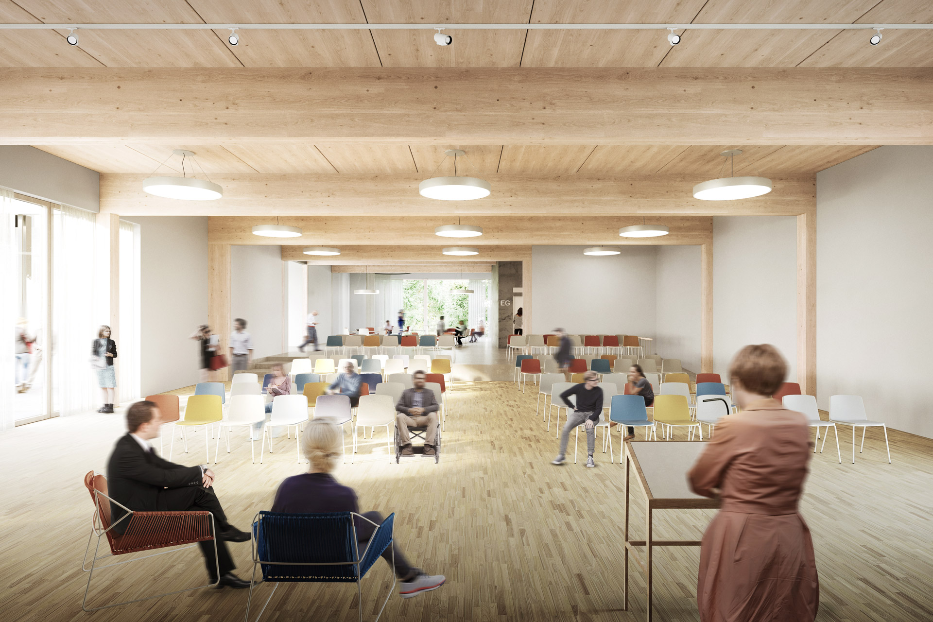 This is achieved with the compact design of the building with a sufficiently insulated shell and robust and intuitive systems adapted to the respective room use. In areas with a high demand for fresh air, such as seminar rooms, meeting rooms and the library, mechanical ventilation is useful, but with highly efficient heat recovery, which minimizes heat loss via ventilation in winter. For particularly hot days there is the possibility of actively cooling the supply air. In the seminar rooms, the supply air is introduced via the ceiling in a CO2-controlled manner according to demand and thus limited to the necessary quantity.