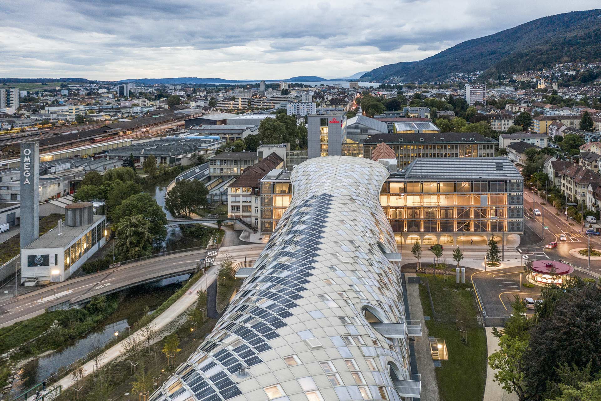 With 1,997 m³ / 70,523 ft³ of indigenous spruce timber, this campus is one of the largest hybrid timber constructions. The three buildings - the Swatch Headquarters, the Omega Factory and the Museum Cité du Temps – are speaking a uniform design language: they share a common material palette and environmental awareness. Each strategy implemented in the project is designed to minimize global impact and serve as a model for future buildings. To achieve an energy-efficient, comfortable working environment, radiant cooling and heating with activated ceiling panels or water pipes embedded in the concrete ceilings are used. The campus uses the regenerative energy potential of groundwater from wells: for heating, heat pumps "collect" the relative heat of the water from the subsurface. The heat itself is free of charge, only the heat pumps need electricity for operation but deliver considerably more energy than they need for operation. When cooling is required, the groundwater is cold enough to lower the temperature in the cooling circuit of the radiant cooling system via heat exchangers: operation in summer does not require heat pumps. Thus, in addition to the heat, the cold is also regenerative and only takes the rather low amount of electrical energy for the pumping. All roofs carry PV modules on surfaces facing southeast or southwest and cover part of the electricity requirement.