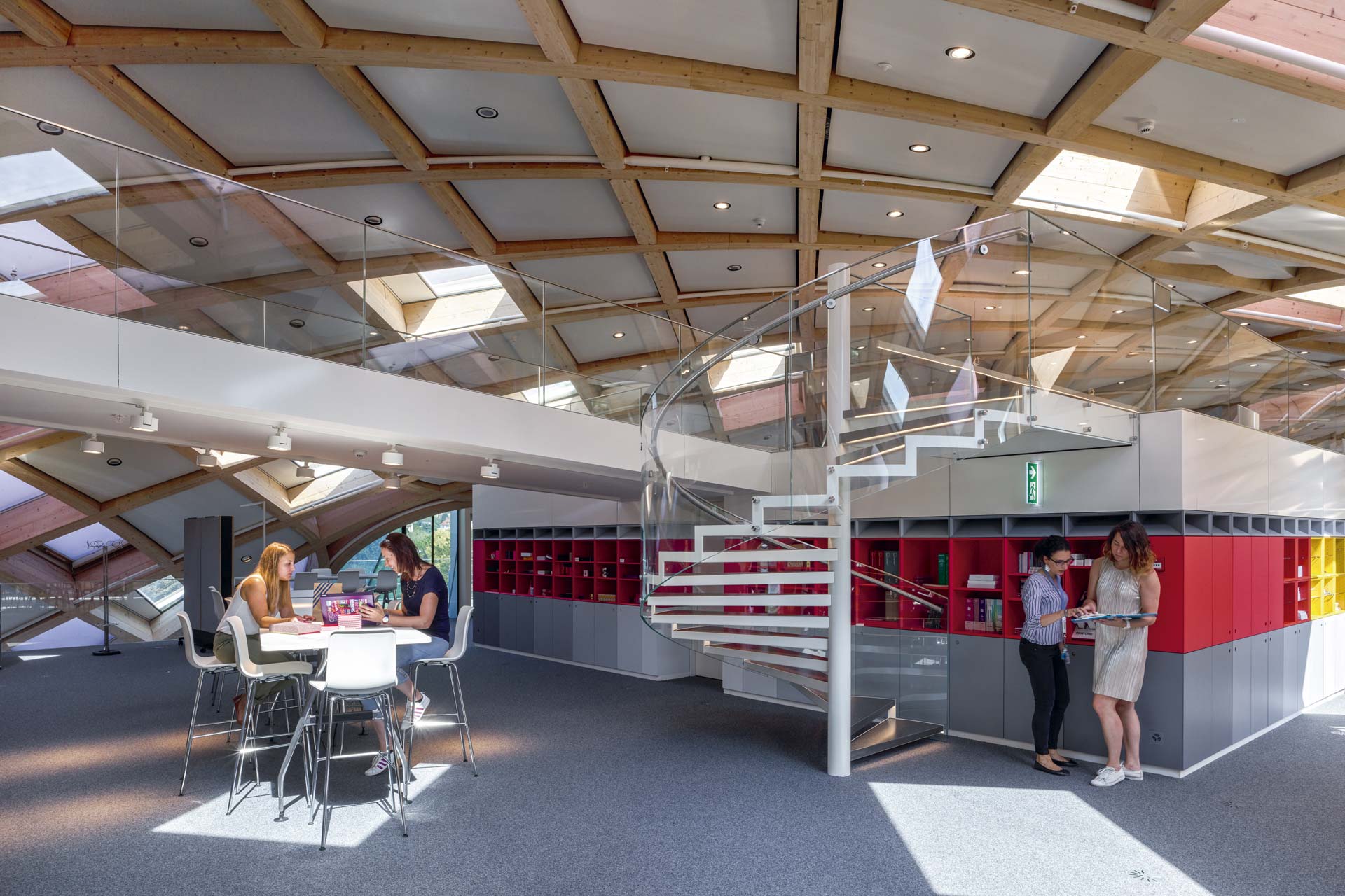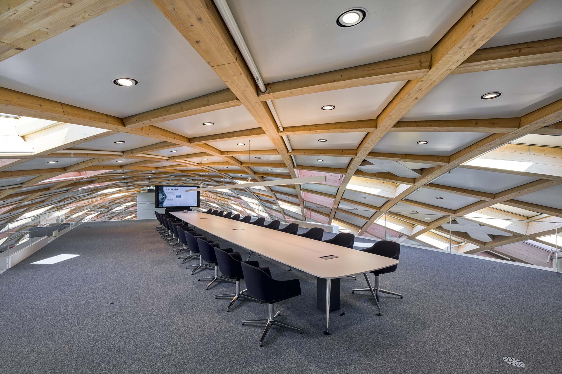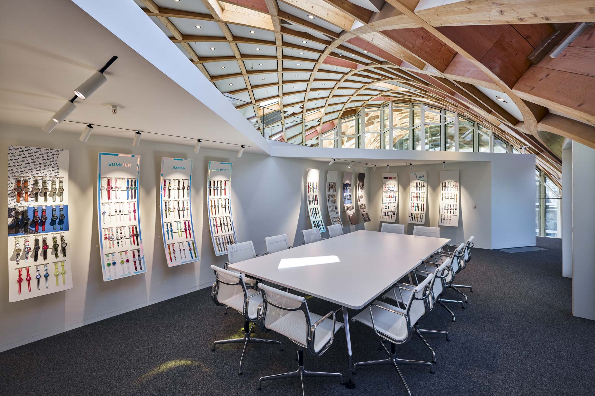 With 1,997 m³ / 70,523 ft³ of indigenous spruce timber, this campus is one of the largest hybrid timber constructions. The three buildings - the Swatch Headquarters, the Omega Factory and the Museum Cité du Temps – are speaking a uniform design language: they share a common material palette and environmental awareness. Each strategy implemented in the project is designed to minimize global impact and serve as a model for future buildings. To achieve an energy-efficient, comfortable working environment, radiant cooling and heating with activated ceiling panels or water pipes embedded in the concrete ceilings are used. The campus uses the regenerative energy potential of groundwater from wells: for heating, heat pumps "collect" the relative heat of the water from the subsurface. The heat itself is free of charge, only the heat pumps need electricity for operation but deliver considerably more energy than they need for operation. When cooling is required, the groundwater is cold enough to lower the temperature in the cooling circuit of the radiant cooling system via heat exchangers: operation in summer does not require heat pumps. Thus, in addition to the heat, the cold is also regenerative and only takes the rather low amount of electrical energy for the pumping. All roofs carry PV modules on surfaces facing southeast or southwest and cover part of the electricity requirement.