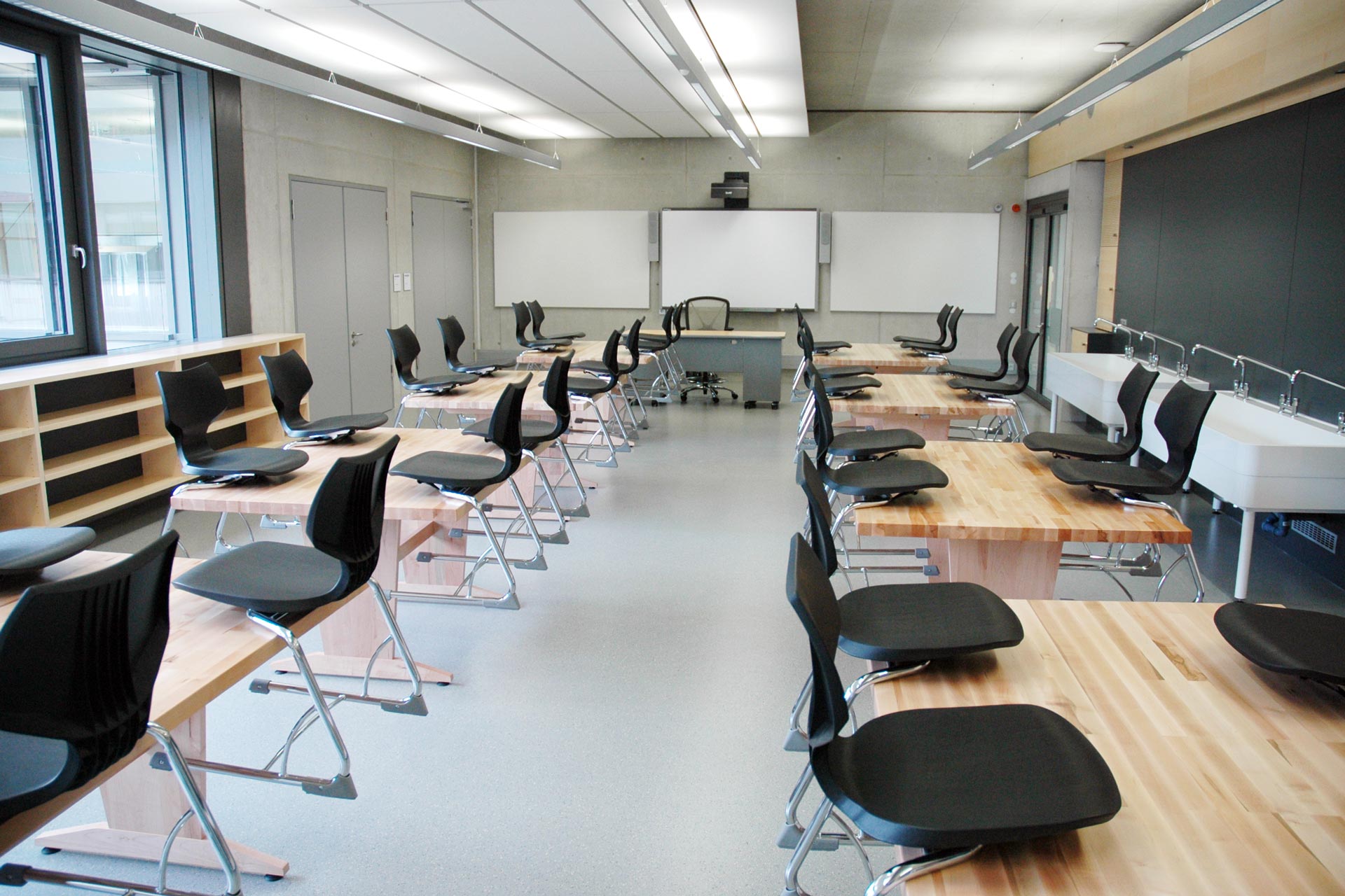 The use of daylight in the classrooms has been optimized through centrally controlled venetian blinds with daylight redirection; the hallways are naturally lit by skylights. The classrooms are ventilated mechanically by displacement ventilation via openings at the bottom of the cabinet zone, additionally natural ventilation is possible via operable windows. In summer night time air cooling activates the thermal mass of the solid concrete, thus ensuring comfortable room temperatures without additional cooling. The school center is environmentally friendly supplied with district heating from cogeneration and waste incineration.