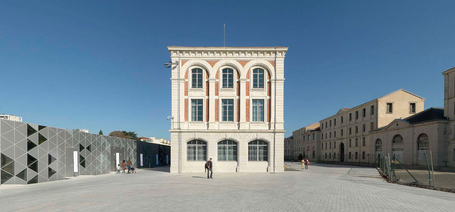The project is designed around the banqueting hall of the former national arms factory. Built at a lower level and with a slightly convex shape, this structure is a combination of a variety of areas: construction resources centre, greenhouse, library, cafeteria, reception area, exhibition rooms, auditorium, amphitheatre.